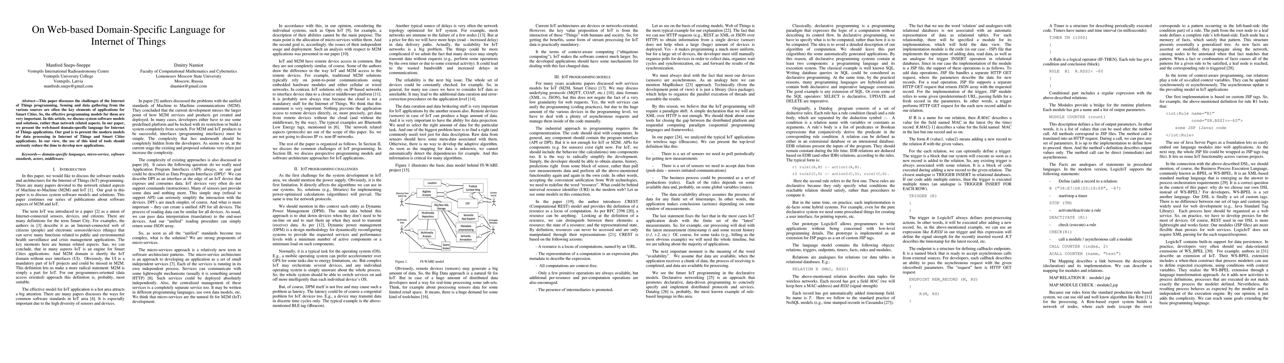 This paper discusses the challenges of the Internet of Things programming. Sensing and data gathering from the various sources are often the key elements of applications for Smart Cities. So, the effective programming models for them are very important. In this article, we discuss system software models and solutions, rather than network related aspects. In our paper, we present the web-based domain-specific language for Internet of Things applications. Our goal is to present the modern models for data processing in Internet of Things and Smart Cities applications. In our view, the use of this kind of tools should seriously reduce the time to develop new applications.