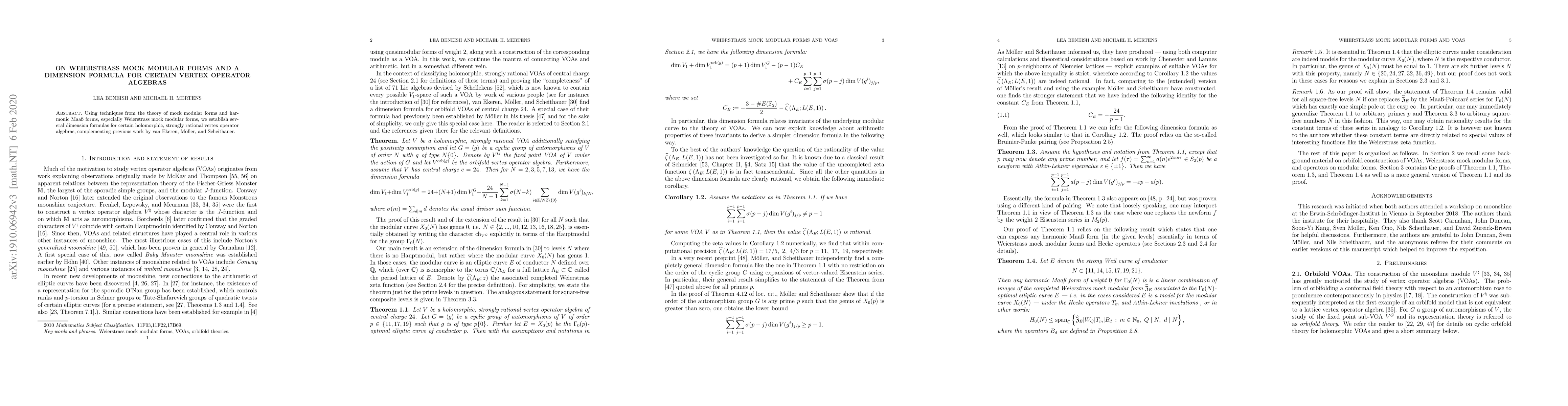 Summary: This paper leverages Weierstrass mock modular forms to derive dimension formulas for specific strongly rational, holomorphic vertex operator algebras, building on and expanding previous results by van Ekeren, Möller, and Scheithauer.