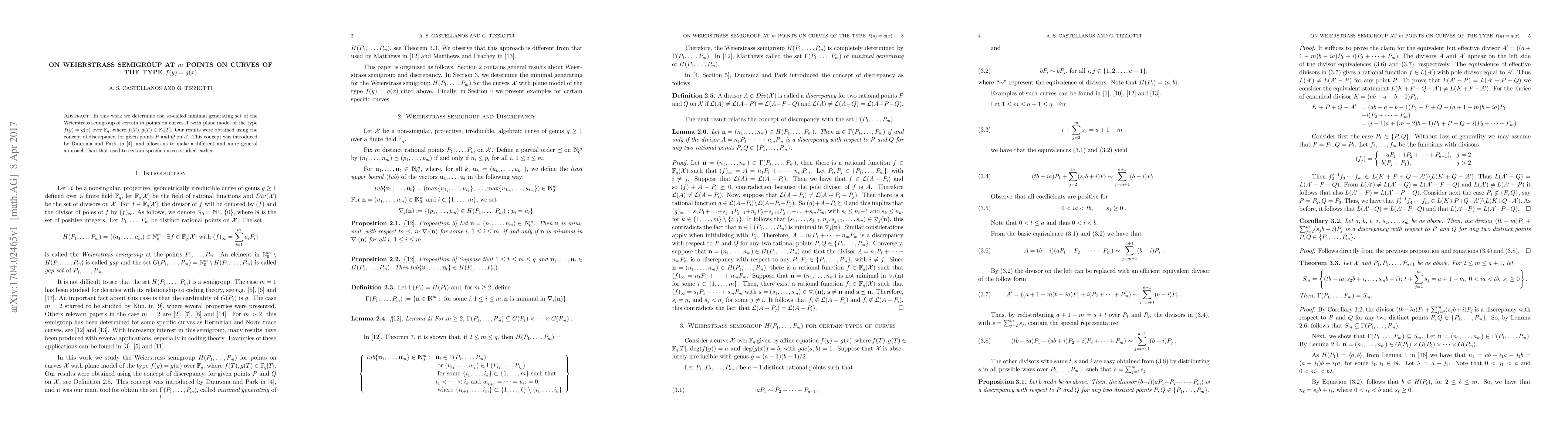 Researchers found a method to determine the minimal generating set of Weierstrass semigroups for certain points on curves defined by f(y) = g(x), using the concept of discrepancy. This approach allows for more general results than previous methods for specific curves.