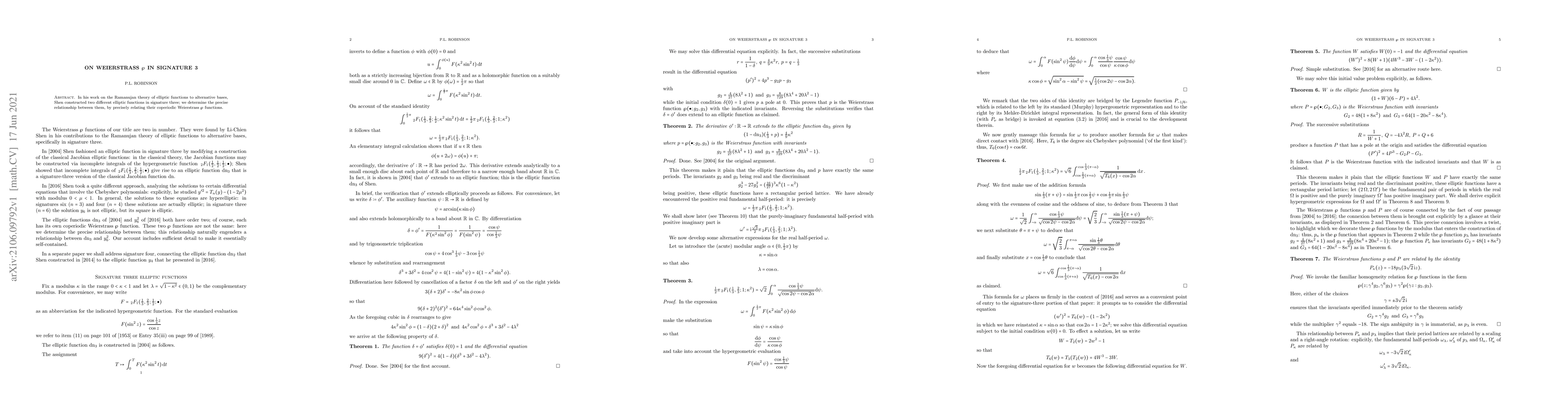 In his work on the Ramanujan theory of elliptic functions to alternative bases, Shen constructed two different elliptic functions in signature three; we determine the precise relationship between them, by precisely relating their coperiodic Weierstrass $\wp$ functions.