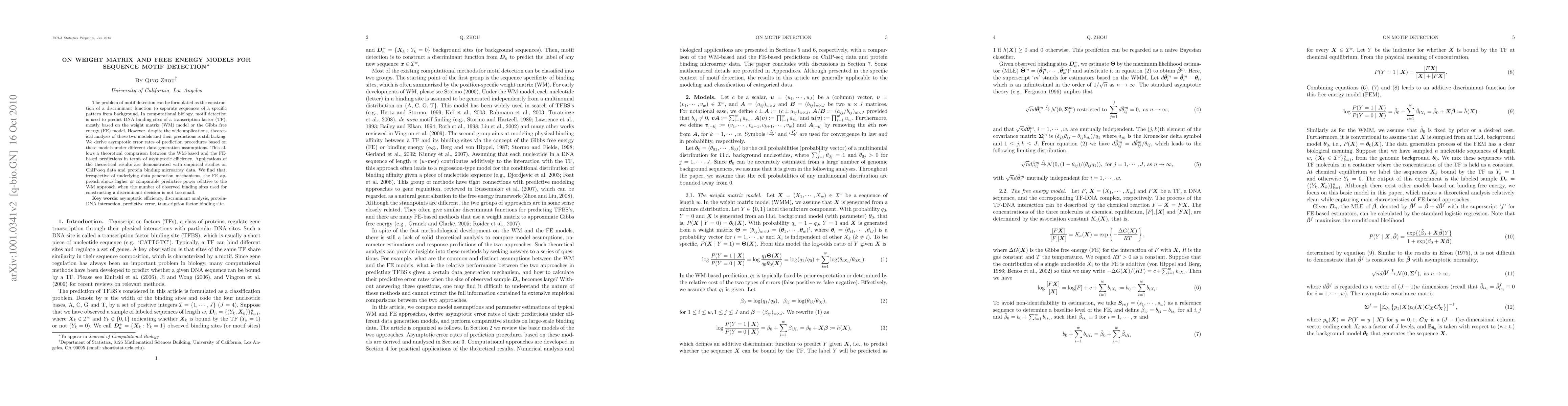 This research derives asymptotic error rates for motif detection models, comparing weight matrix and Gibbs free energy approaches. Empirical studies show the free energy method generally outperforms or matches the weight matrix method, especially with a larger number of observed binding sites.
