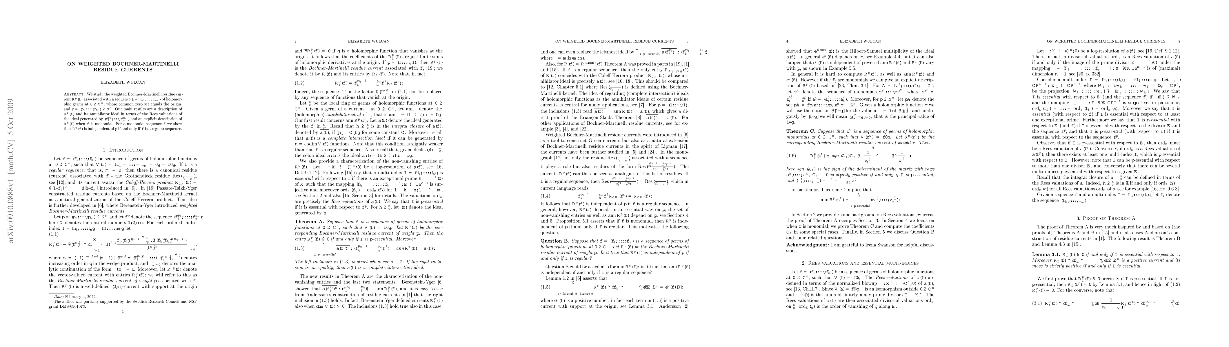 We study the weighted Bochner-Martinelli residue current R^p(f) associated with a sequence f=(f_1,...,f_m) of holomorphic germs at the origin in C^n, whose common zero set equals the origin, and p=(p_1,..., p_m)\in N^n. Our main results are a description of R^p(f) and its annihilator ideal in terms of the Rees valuations of the ideal generated by (f_1^{p_1},..., f_m^{p_m}) and an explicit description of R^p(f) when f is monomial. For a monomial sequence f we show that R^p(f) is independent of p if and only if f is a regular sequence.