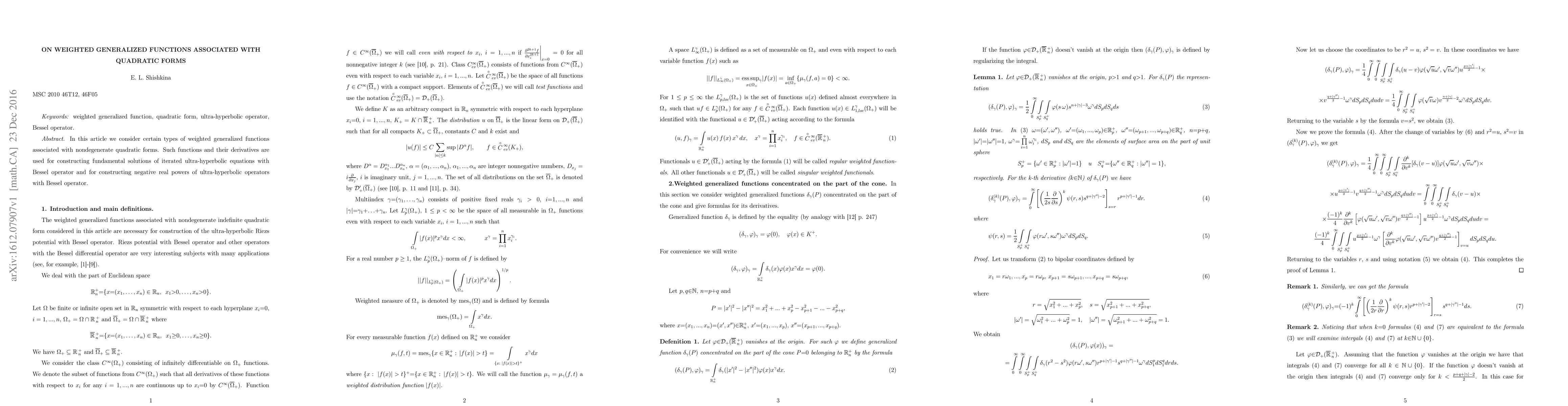 In this article we consider certain types of weighted generalized functions associated with nondegenerate quadratic forms. Such functions and their derivatives are used for constructing fundamental solutions of iterated ultra-hyperbolic equations with Bessel operator and for constructing negative real powers of ultra-hyperbolic operators with Bessel operator.