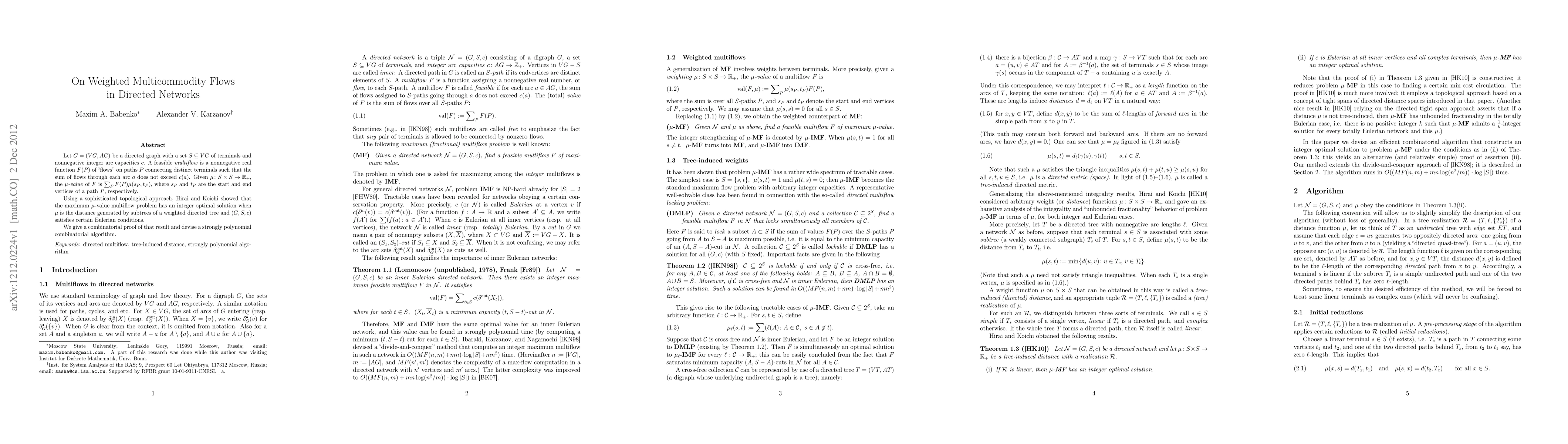 Let $G = (VG, AG)$ be a directed graph with a set $S \subseteq VG$ of terminals and nonnegative integer arc capacities $c$. A feasible multiflow is a nonnegative real function $F(P)$ of "flows" on paths $P$ connecting distinct terminals such that the sum of flows through each arc $a$ does not exceed $c(a)$. Given $\mu \colon S \times S \to \R_+$, the \emph{$\mu$-value} of $F$ is $\sum_P F(P) \mu(s_P, t_P)$, where $s_P$ and $t_P$ are the start and end vertices of a path $P$, respectively. Using a sophisticated topological approach, Hirai and Koichi showed that the maximum $\mu$-value multiflow problem has an integer optimal solution when $\mu$ is the distance generated by subtrees of a weighted directed tree and $(G,S,c)$ satisfies certain Eulerian conditions. We give a combinatorial proof of that result and devise a strongly polynomial combinatorial algorithm.