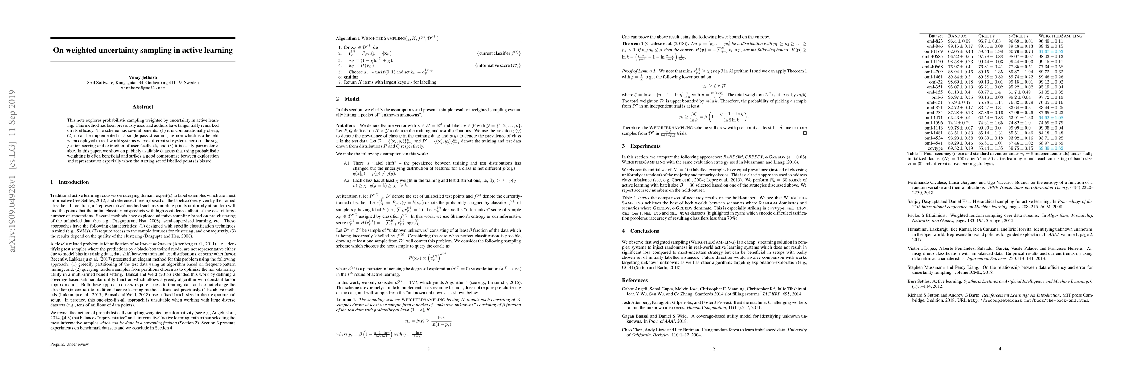 This note explores probabilistic sampling weighted by uncertainty in active learning. This method has been previously used and authors have tangentially remarked on its efficacy. The scheme has several benefits: (1) it is computationally cheap, (2) it can be implemented in a single-pass streaming fashion which is a benefit when deployed in real-world systems where different subsystems perform the suggestion scoring and extraction of user feedback, and (3) it is easily parameterizable. In this paper, we show on publicly available datasets that using probabilistic weighting is often beneficial and strikes a good compromise between exploration and representation especially when the starting set of labelled points is biased.