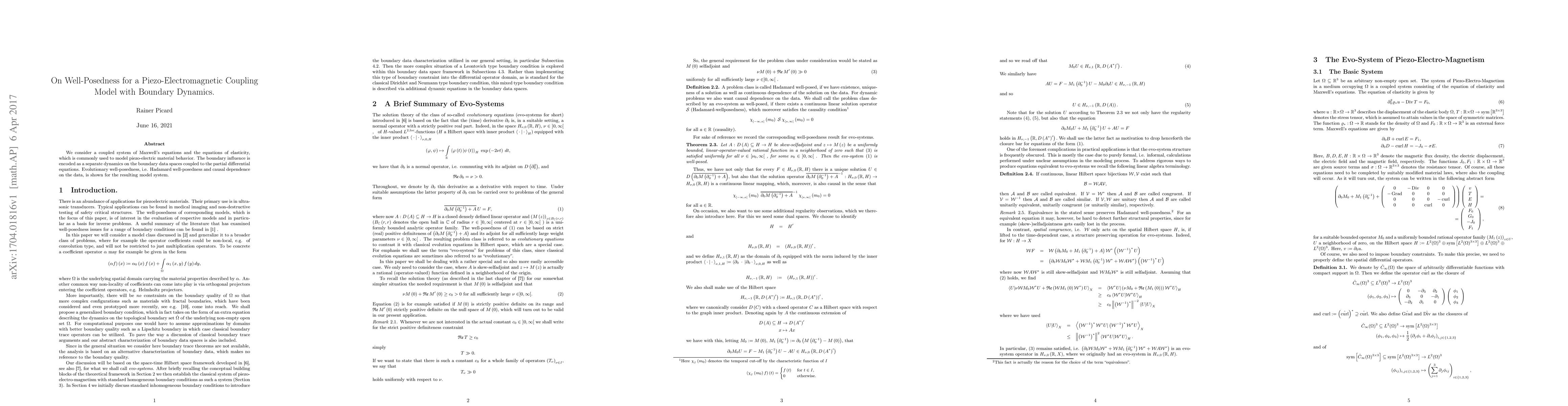 This paper investigates a coupled system of Maxwell's equations and elasticity to model piezo-electromagnetic behavior, incorporating boundary dynamics. It demonstrates evolutionary well-posedness and causal dependence of the resulting model system on the input data.