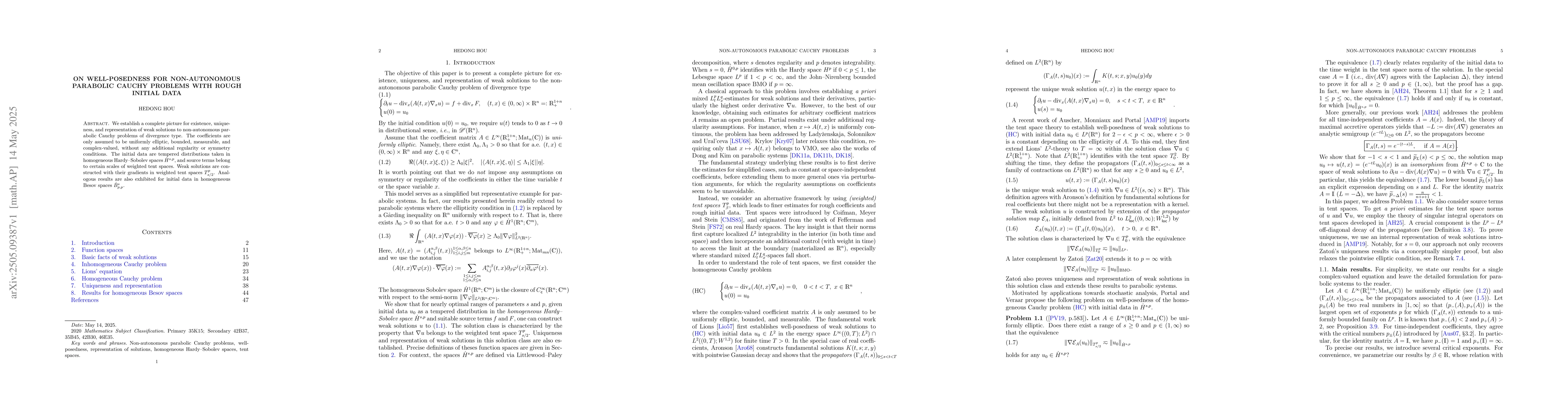 This work extends existing well-posedness results by relaxing regularity assumptions on coefficients and initial data, allowing for complex-valued, measurable, and bounded coefficients, as well as tempered distribution initial data in homogeneous Hardy-Sobolev and Besov spaces.
