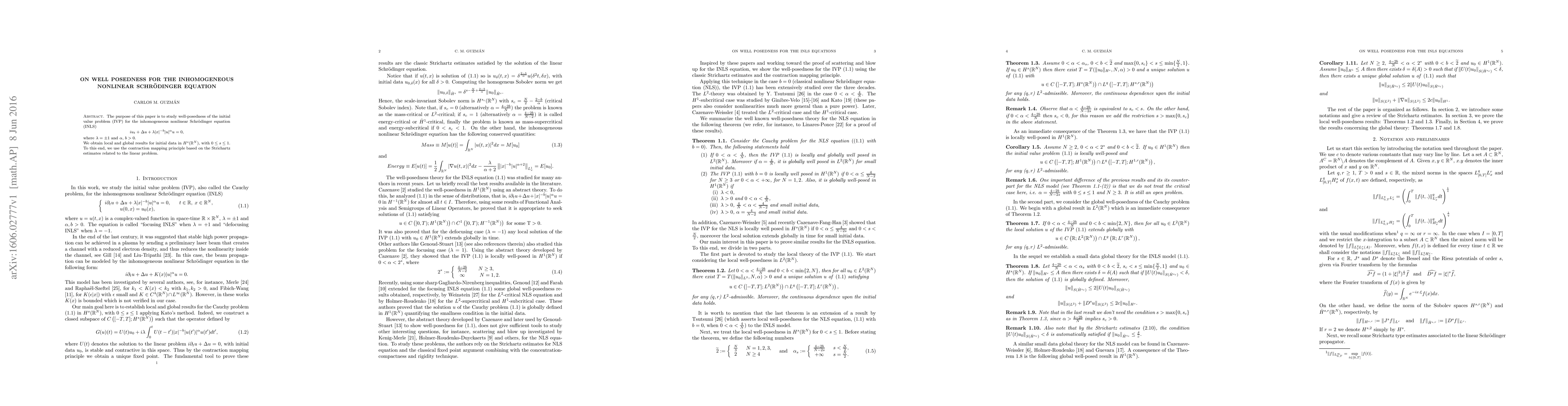 This paper investigates well-posedness for the inhomogeneous nonlinear Schrödinger equation, obtaining local and global results for initial data in $H^s(\mathbb{R}^N)$ with $0\leq s\leq 1$, utilizing the contraction mapping principle and Strichartz estimates.