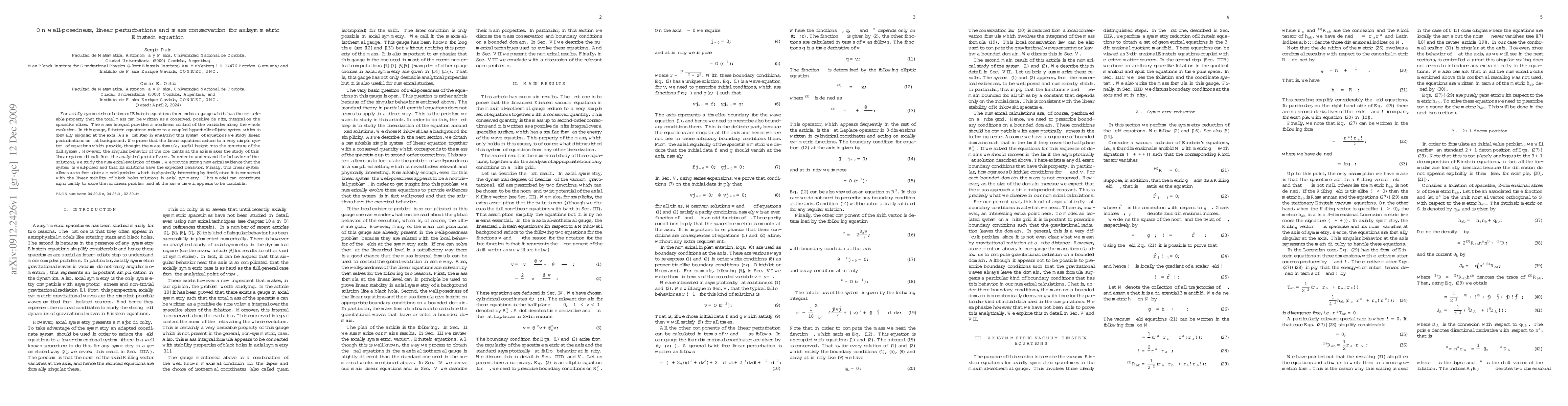 For axially symmetric solutions of Einstein equations there exists a gauge which has the remarkable property that the total mass can be written as a conserved, positive definite, integral on the spacelike slices. The mass integral provides a nonlinear control of the variables along the whole evolution. In this gauge, Einstein equations reduce to a coupled hyperbolic-elliptic system which is formally singular at the axis. As a first step in analyzing this system of equations we study linear perturbations on flat background. We prove that the linear equations reduce to a very simple system of equations which provide, thought the mass formula, useful insight into the structure of the full system. However, the singular behavior of the coefficients at the axis makes the study of this linear system difficult from the analytical point of view. In order to understand the behavior of the solutions, we study the numerical evolution of them. We provide strong numerical evidence that the system is well-posed and that its solutions have the expected behavior. Finally, this linear system allows us to formulate a model problem which is physically interesting by itself, since it is connected with the linear stability of black holes solutions in axial symmetry. This model can contribute significantly to solve the nonlinear problem and at the same time it appears to be tractable.
