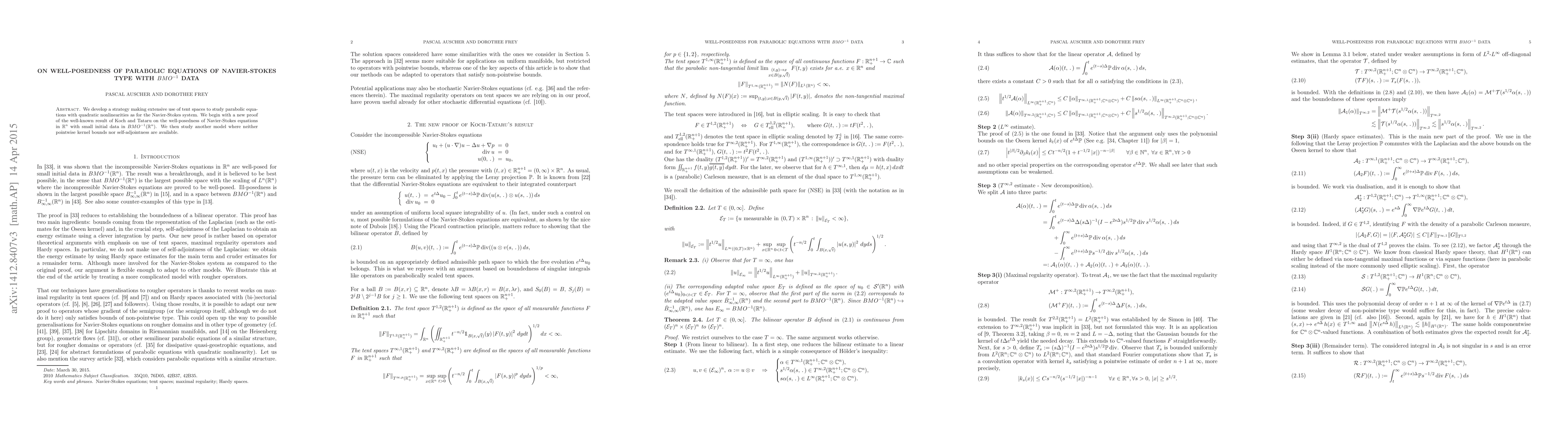 We develop a strategy making extensive use of tent spaces to study parabolic equa-tions with quadratic nonlinearities as for the Navier-Stokes system. We begin with a new proof of the well-known result of Koch and Tataru on the well-posedness of Navier-Stokes equations in \R^n with small initial data in BMO^{-1}(\R^n). We then study another model where neither pointwise kernel bounds nor self-adjointness are available.
