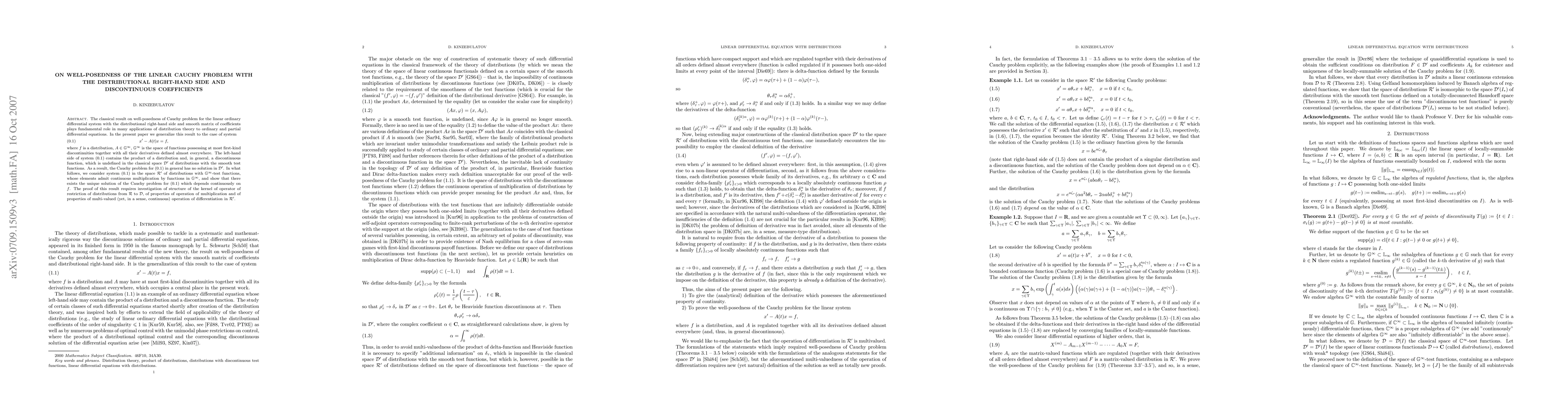 Researchers prove the well-posedness of a linear Cauchy problem with a distributional right-hand side and discontinuous coefficients, finding a unique solution that depends continuously on the input distribution.