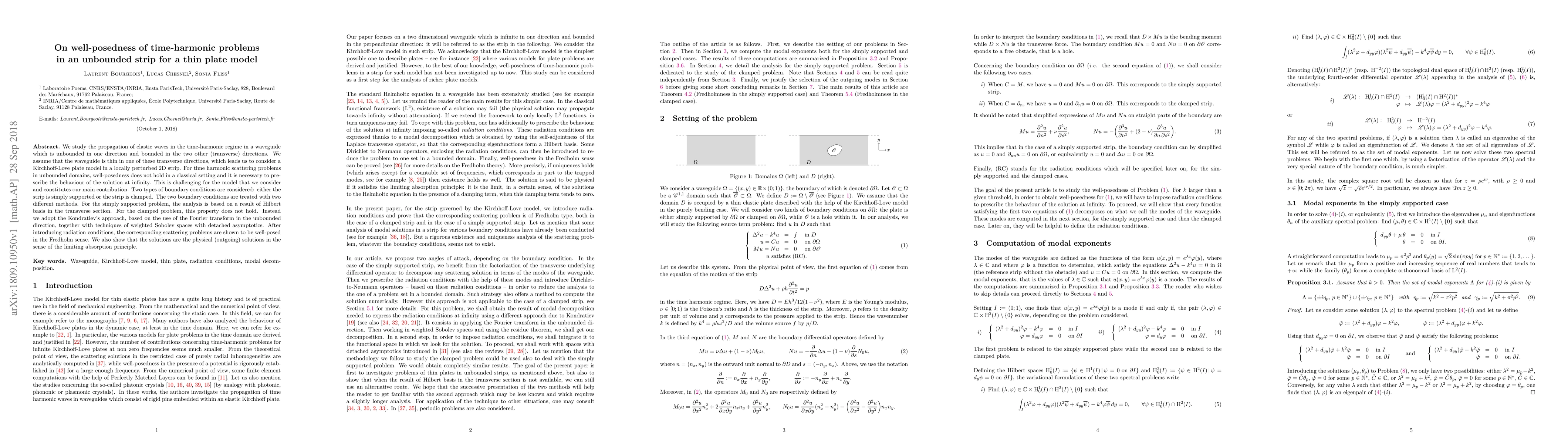We study the propagation of elastic waves in the time-harmonic regime in a waveguide which is unbounded in one direction and bounded in the two other (transverse) directions. We assume that the waveguide is thin in one of these transverse directions, which leads us to consider a Kirchhoff-Love plate model in a locally perturbed 2D strip. For time harmonic scattering problems in unbounded domains, well-posedness does not hold in a classical setting and it is necessary to prescribe the behaviour of the solution at infinity. This is challenging for the model that we consider and constitutes our main contribution. Two types of boundary conditions are considered: either the strip is simply supported or the strip is clamped. The two boundary conditions are treated with two different methods. For the simply supported problem, the analysis is based on a result of Hilbert basis in the transverse section. For the clamped problem, this property does not hold. Instead we adopt the Kondratiev's approach, based on the use of the Fourier transform in the unbounded direction, together with techniques of weighted Sobolev spaces with detached asymptotics. After introducing radiation conditions, the corresponding scattering problems are shown to be well-posed in the Fredholm sense. We also show that the solutions are the physical (outgoing) solutions in the sense of the limiting absorption principle.