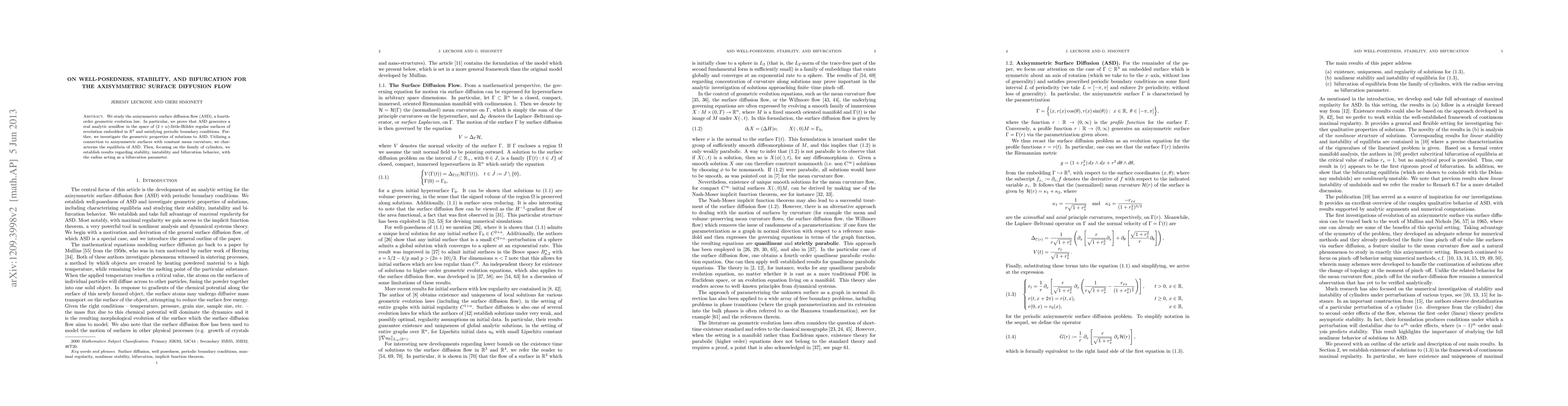 In this article, we study the axisymmetric surface diffusion flow (ASD), a fourth-order geometric evolution law. In particular, we prove that ASD generates a real analytic semiflow in the space of (2 + \alpha)-little-H\"older regular surfaces of revolution embedded in R^3 and satisfying periodic boundary conditions. We also give conditions for global existence of solutions and prove that solutions are real analytic in time and space. Further, we investigate the geometric properties of solutions to ASD. Utilizing a connection to axisymmetric surfaces with constant mean curvature, we characterize the equilibria of ASD. Then, focusing on the family of cylinders, we establish results regarding stability, instability and bifurcation behavior, with the radius acting as a bifurcation parameter for the problem.