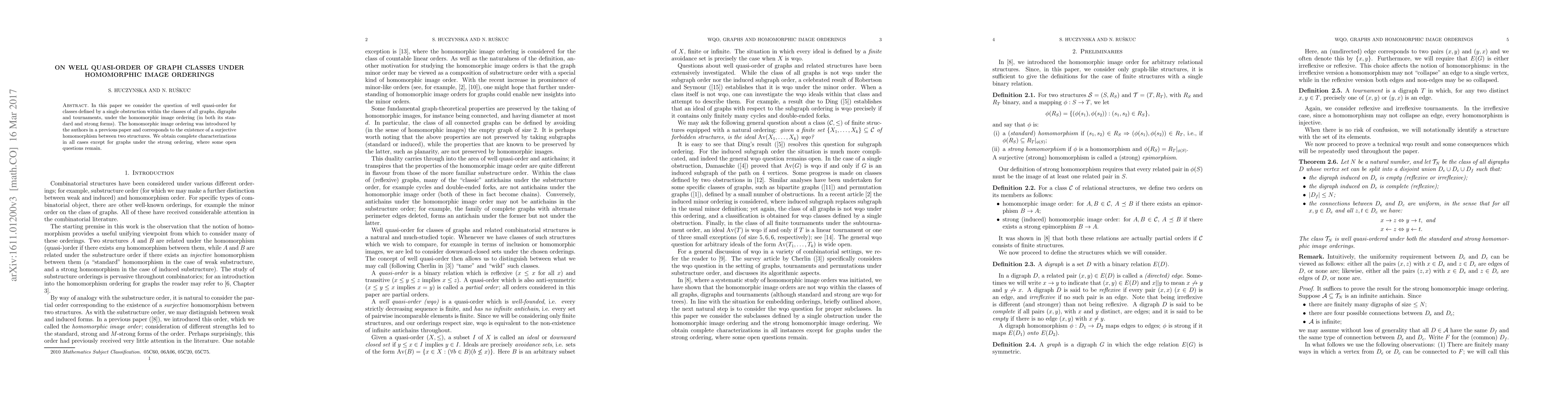 This paper investigates whether classes of graphs, digraphs, and tournaments have well quasi-order under homomorphic image ordering, with complete characterizations found for most cases except for strong ordering in graphs.