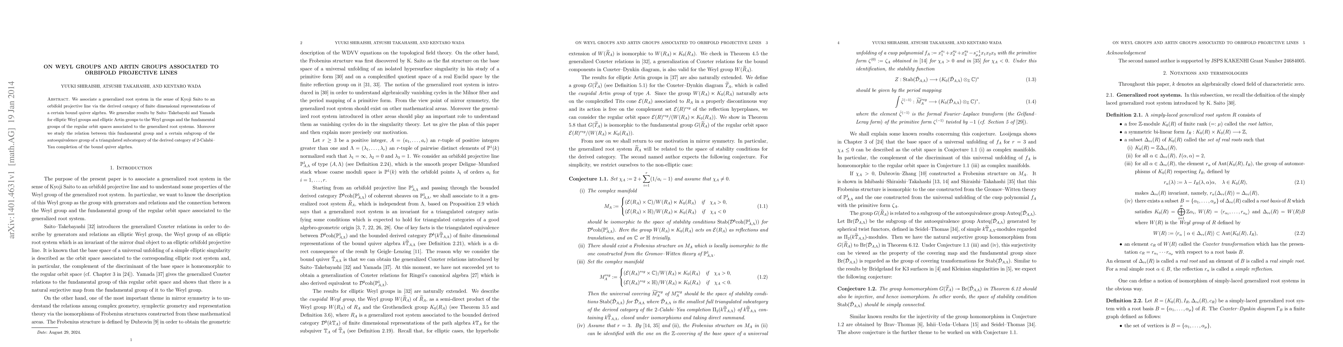 This paper explores the relationship between orbifold projective lines and Weyl groups/Artin groups associated with generalized root systems, shedding light on their fundamental groups and connections to the autoequivalence group of a related category.
