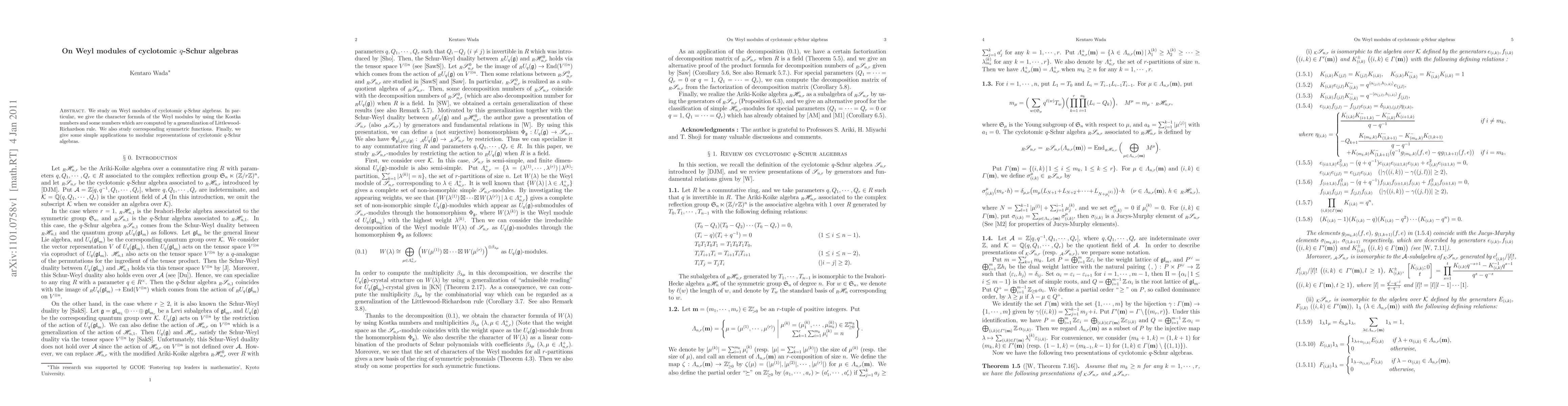 This paper provides a character formula for Weyl modules of cyclotomic $q$-Schur algebras using Kostka numbers and generalized Littlewood-Richardson rules, and explores corresponding symmetric functions and modular representation applications.