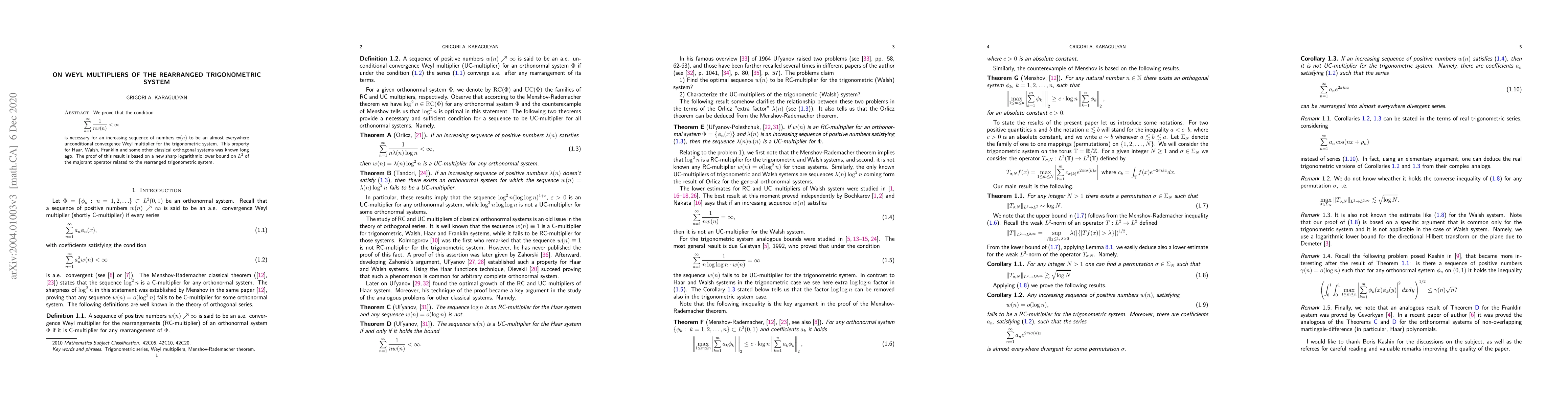 We prove that the condition \begin{equation} \sum_{n=1}^\infty\frac{1}{nw(n)}<\infty \end{equation} is necessary for an increasing sequence of numbers $w(n)$ to be an almost everywhere unconditional convergence Weyl multiplier for the trigonometric system. This property for Haar, Walsh, Franklin and some other classical orthogonal systems was known long ago. The proof of this result is based on a new sharp logarithmic lower bound on $L^2$ of the majorant operator related to the rearranged trigonometric system.