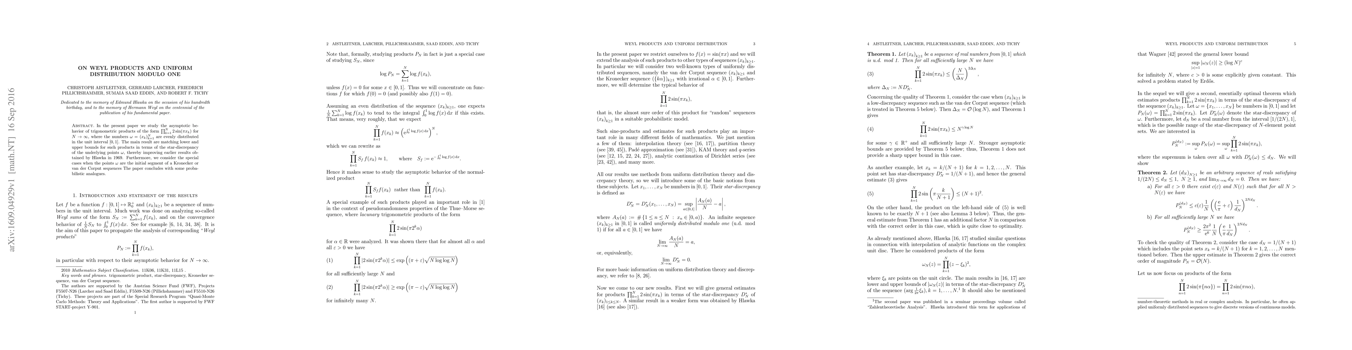 In the present paper we study the asymptotic behavior of trigonometric products of the form $\prod_{k=1}^N 2 \sin(\pi x_k)$ for $N \to \infty$, where the numbers $\omega=(x_k)_{k=1}^N$ are evenly distributed in the unit interval $[0,1]$. The main result are matching lower and upper bounds for such products in terms of the star-discrepancy of the underlying points $\omega$, thereby improving earlier results obtained by Hlawka in 1969. Furthermore, we consider the special cases when the points $\omega$ are the initial segment of a Kronecker or van der Corput sequence. The paper concludes with some probabilistic analogues.