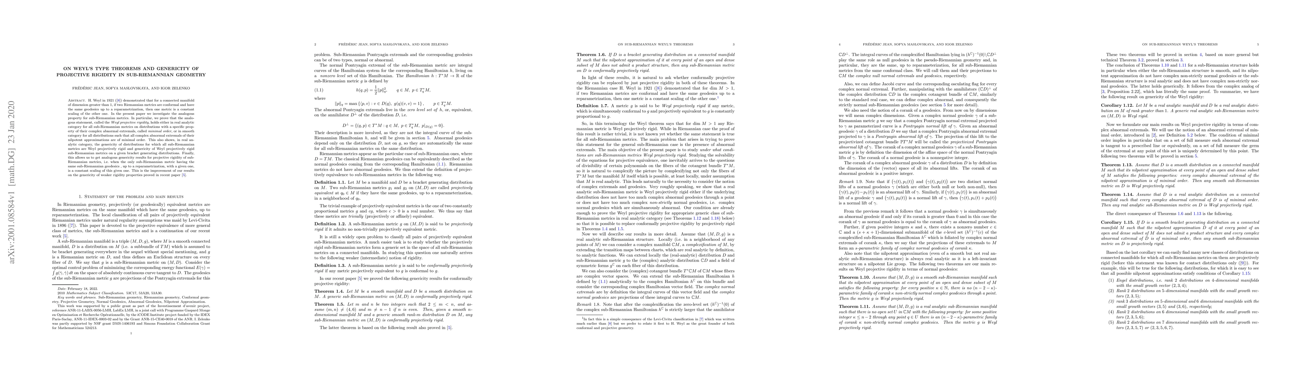 H. Weyl in 1921 demonstrated that for a connected manifold of dimension greater than $1$, if two Riemannian metrics are conformal and have the same geodesics up to a reparametrization, then one metric is a constant scaling of the other one. In the present paper, we investigate the analogous property for sub-Riemannian metrics. In particular, we prove that the analogous statement, called the Weyl projective rigidity, holds either in real analytic category for all sub-Riemannian metrics on distributions with a specific property of their complex abnormal extremals, called minimal order, or in smooth category for all distributions such that all complex abnormal extremals of their nilpotent approximations are of minimal order. This also shows, in real analytic category, the genericity of distributions for which all sub-Riemannian metrics are Weyl projectively rigid and genericity of Weyl projectively rigid sub-Riemannian metrics on a given bracket generating distributions. Finally, this allows us to get analogous genericity results for projective rigidity of sub-Riemannian metrics, i.e.when the only sub-Riemannian metric having the same sub-Riemannian geodesics, up to a reparametrization, with a given one, is a constant scaling of this given one. This is the improvement of our results on the genericity of weaker rigidity properties proved in recent paper arXiv:1801.04257[math.DG].
