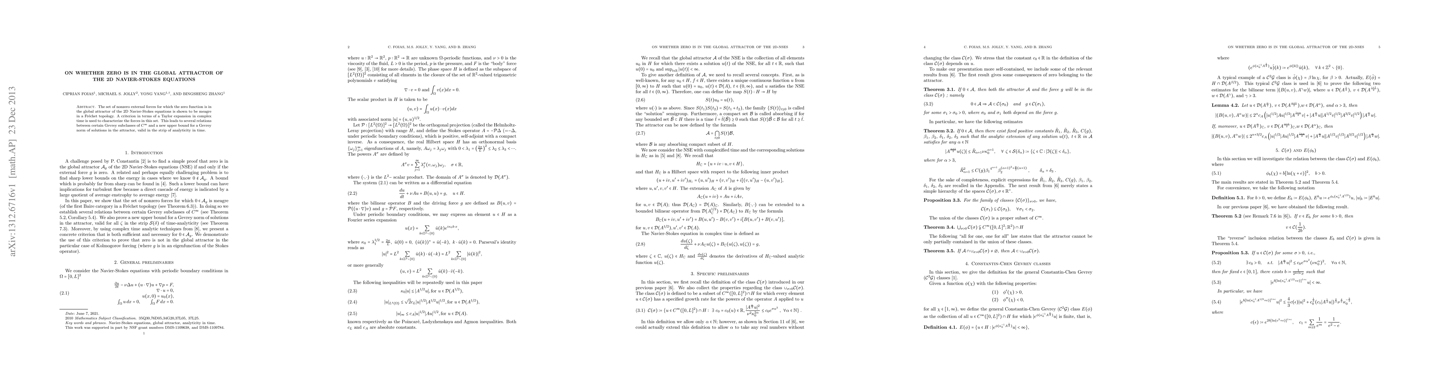 Summary: The paper demonstrates that zero is not typically in the global attractor of the 2D Navier-Stokes equations under nonzero external forces, showing this set is meagre. It introduces a criterion based on Taylor expansion in complex time to characterize these forces and derives new upper bounds for Gevrey norms of solutions in the attractor.