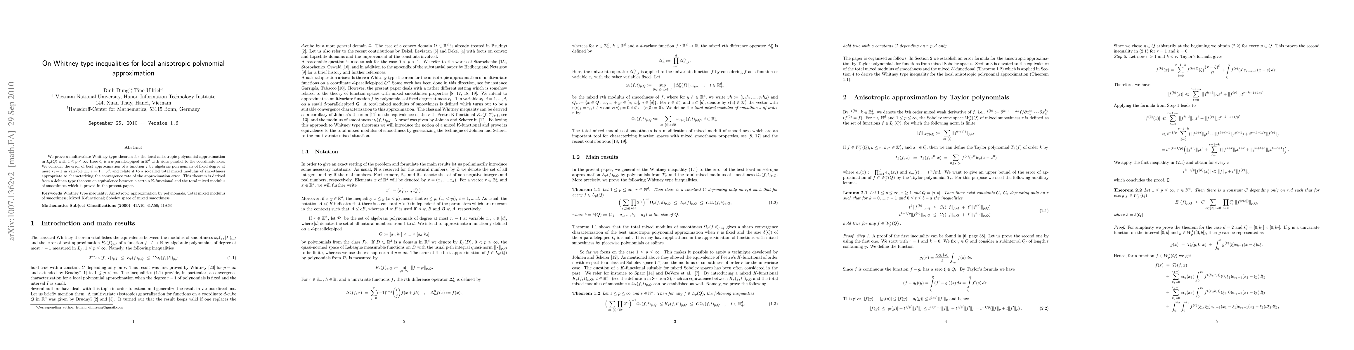 This paper proves a multivariate Whitney type theorem for local anisotropic polynomial approximation in $L_p(Q)$ spaces with $1 eq p eq infty$, establishing a key link between approximation error and smoothness measures.