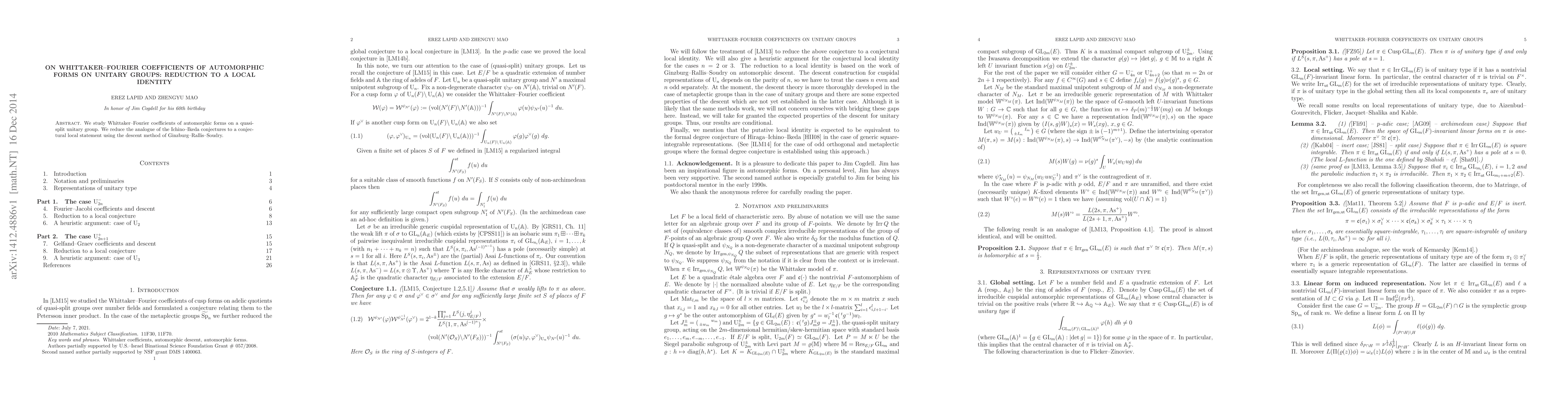 Summary: This paper investigates Whittaker-Fourier coefficients of automorphic forms on quasi-split unitary groups, employing the descent method to reduce global conjectures to a local conjectural identity.