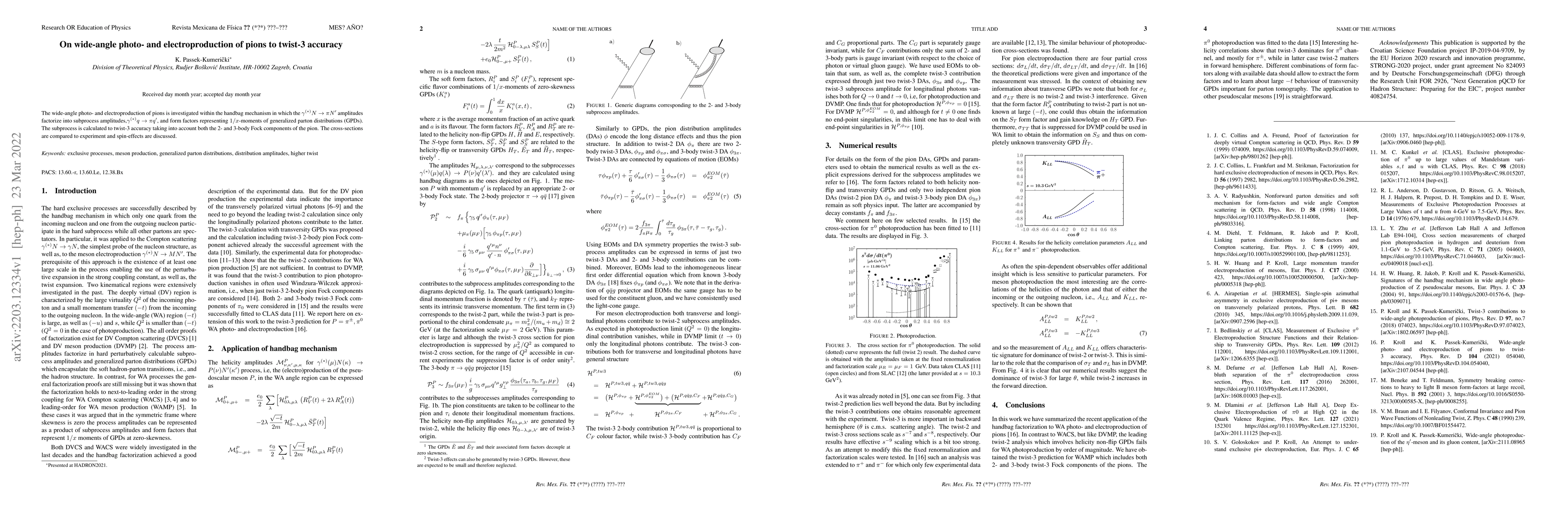 The wide-angle photo- and electroproduction of pions is investigated within the handbag mechanism in which the $\gamma^{(*)} N\to \pi N'$ amplitudes factorize into subprocess amplitudes,$\gamma^{(*)} q\to \pi q'$, and form factors representing $1/x$-moments of generalized parton distributions (GPDs). The subprocess is calculated to twist-3 accuracy taking into account both the 2- and 3-body Fock components of the pion. The cross-sections are compared to experiment and spin-effects are discussed.