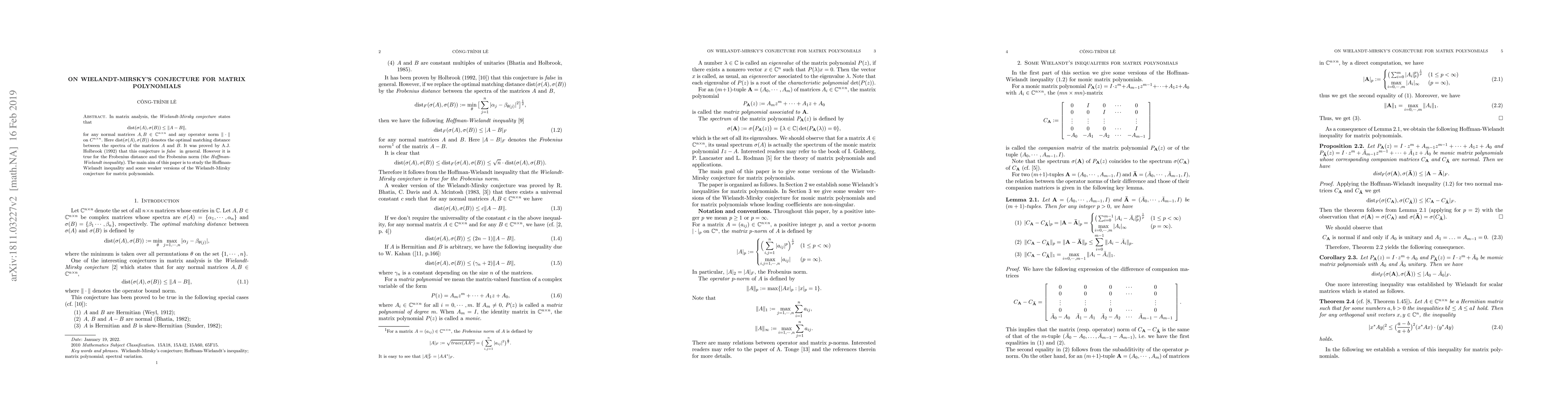 In matrix analysis, the \textit{Wielandt-Mirsky conjecture} states that $$ dist(\sigma(A), \sigma(B)) \leq \|A-B\|, $$ for any normal matrices $ A, B \in \mathbb C^{n\times n}$ and any operator norm $\|\cdot \|$ on $C^{n\times n}$. Here $dist(\sigma(A), \sigma(B))$ denotes the optimal matching distance between the spectra of the matrices $A$ and $B$. It was proved by A.J. Holbrook (1992) that this conjecture is false in general. However it is true for the Frobenius distance and the Frobenius norm (the Hoffman-Wielandt inequality). The main aim of this paper is to study the Hoffman-Wielandt inequality and some weaker versions of the Wielandt-Mirsky conjecture for matrix polynomials.