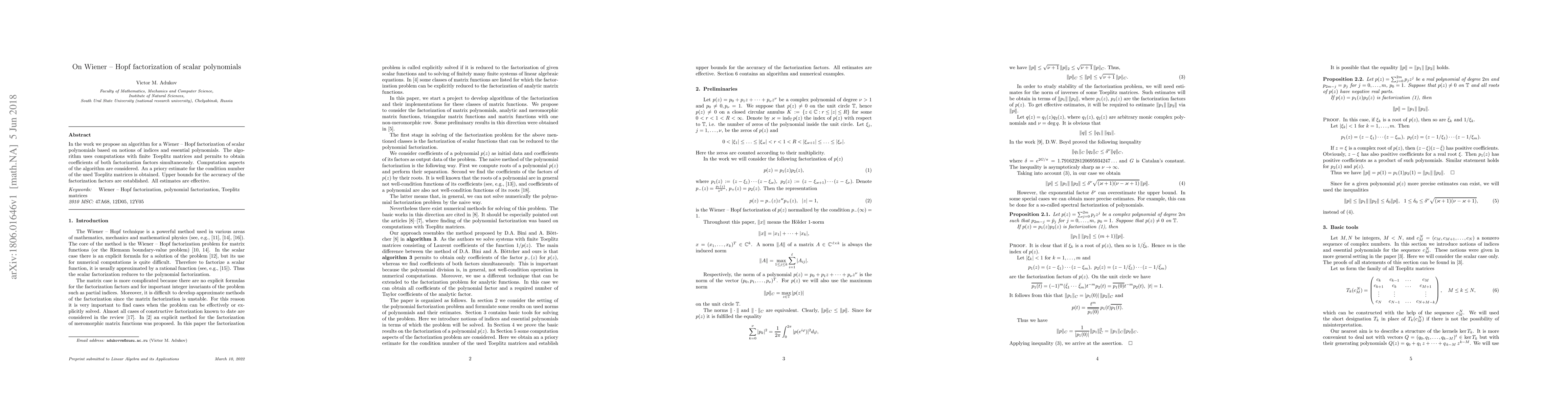 This paper proposes an algorithm for Wiener-Hopf factorization of scalar polynomials based on indices and essential polynomials, utilizing finite Toeplitz matrices to compute factorization factors simultaneously. It also provides an a priori estimate for the condition number of Toeplitz matrices and establishes upper bounds for the accuracy of the factors.