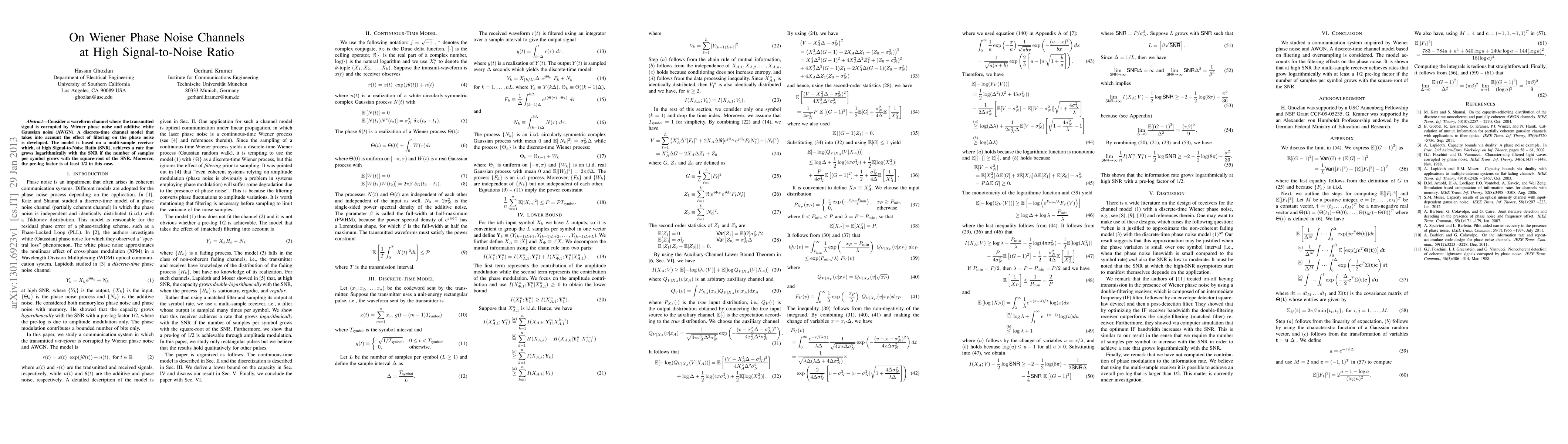 This paper develops a discrete-time channel model for Wiener phase noise corrupted by additive white Gaussian noise, showing that at high SNR, the achievable rate grows logarithmically with SNR if the number of samples per symbol scales with the square-root of SNR, with a pre-log factor of at least 1/2.