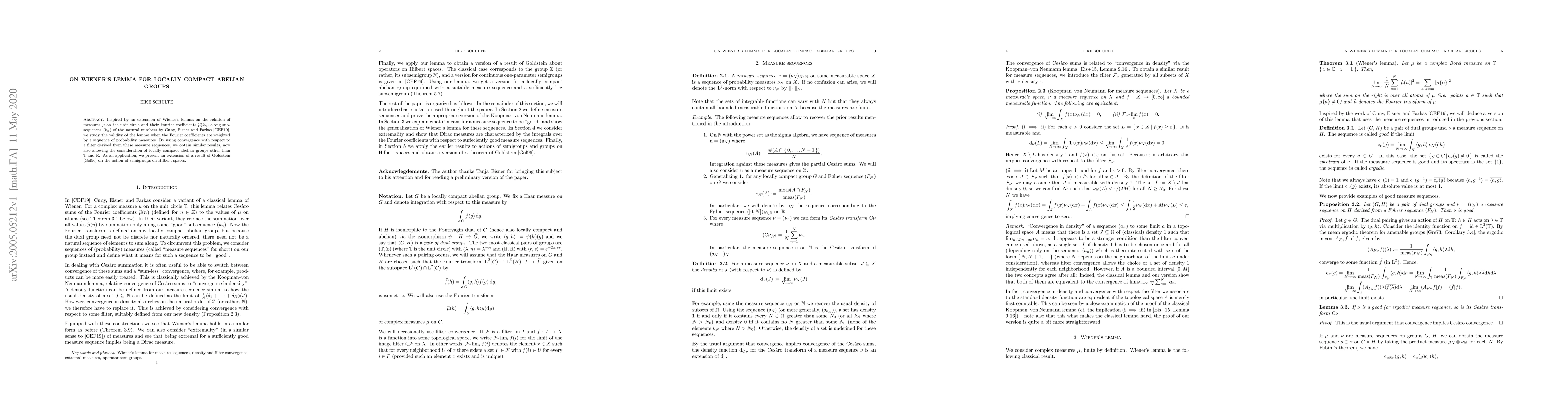 This paper extends Wiener's lemma to locally compact abelian groups by weighting Fourier coefficients with sequences of probability measures. The authors achieve this through convergence with respect to a filter derived from these measure sequences, broadening the lemma's applicability beyond the unit circle and real line.