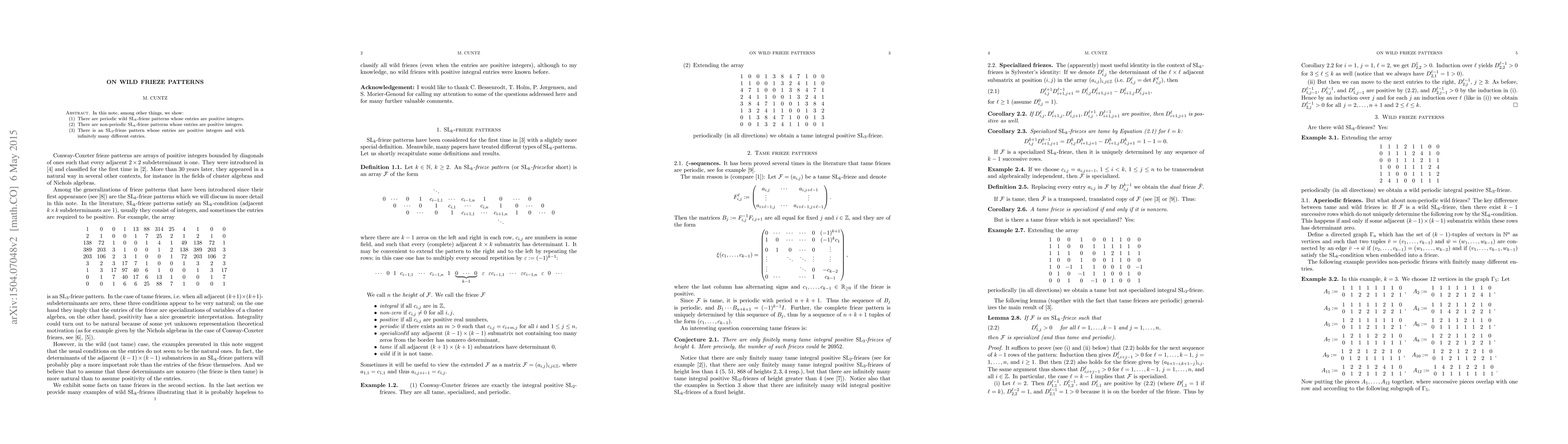 In this note, among other things, we show: There are periodic wild SLk-frieze patterns whose entries are positive integers. There are non-periodic SLk-frieze patterns whose entries are positive integers. There is an SL3-frieze pattern whose entries are positive integers and with infinitely many different entries.