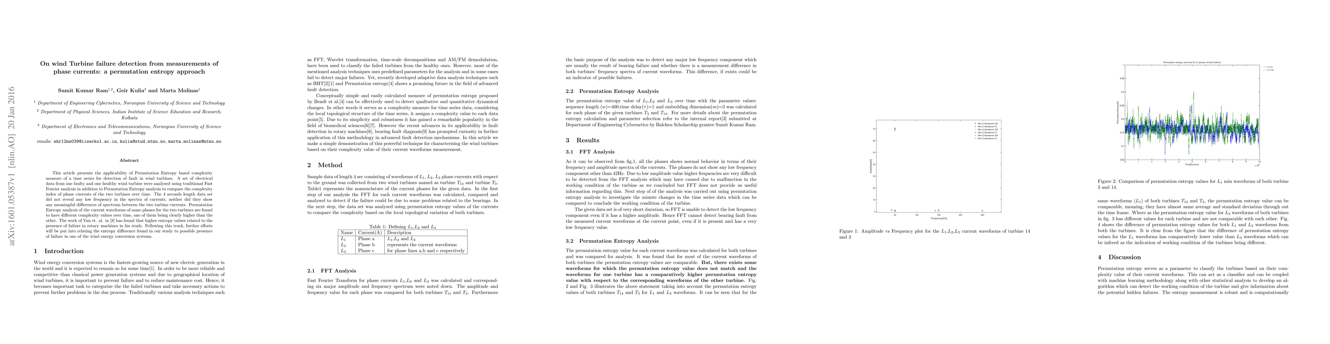This paper explores the use of Permutation Entropy to detect faults in wind turbines by analyzing phase current measurements. While traditional FastFourier analysis showed no differences, Permutation Entropy revealed distinct complexity values over time, suggesting potential failure in one turbine.