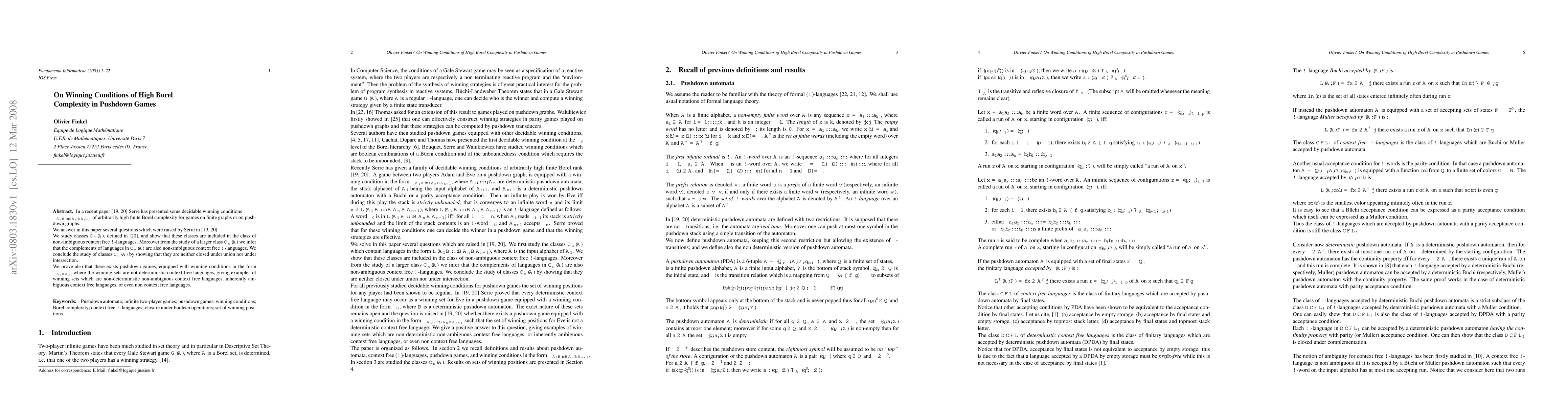 Some decidable winning conditions of arbitrarily high finite Borel complexity for games on finite graphs or on pushdown graphs have been recently presented by O. Serre in [ Games with Winning Conditions of High Borel Complexity, in the Proceedings of the International Conference ICALP 2004, LNCS, Volume 3142, p. 1150-1162 ]. We answer in this paper several questions which were raised by Serre in the above cited paper. We first show that, for every positive integer n, the class C_n(A), which arises in the definition of decidable winning conditions, is included in the class of non-ambiguous context free omega languages, and that it is neither closed under union nor under intersection. We prove also that there exists pushdown games, equipped with such decidable winning conditions, where the winning sets are not deterministic context free languages, giving examples of winning sets which are non-deterministic non-ambiguous context free languages, inherently ambiguous context free languages, or even non context free languages.