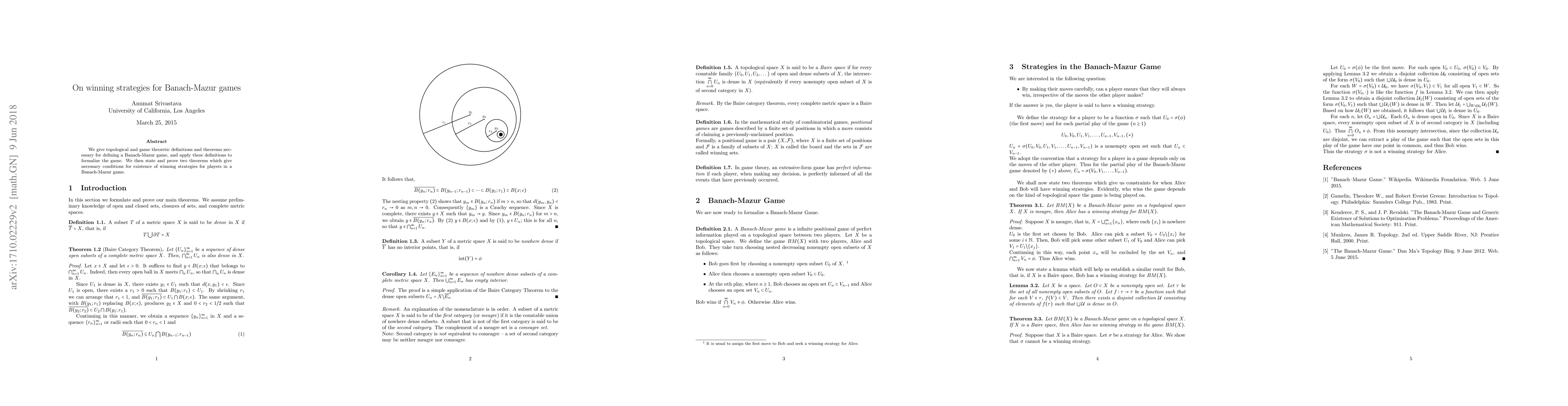 This paper defines Banach-Mazur games using topological and game theoretic concepts, and proves two theorems that establish necessary conditions for the existence of winning strategies for players in these games.