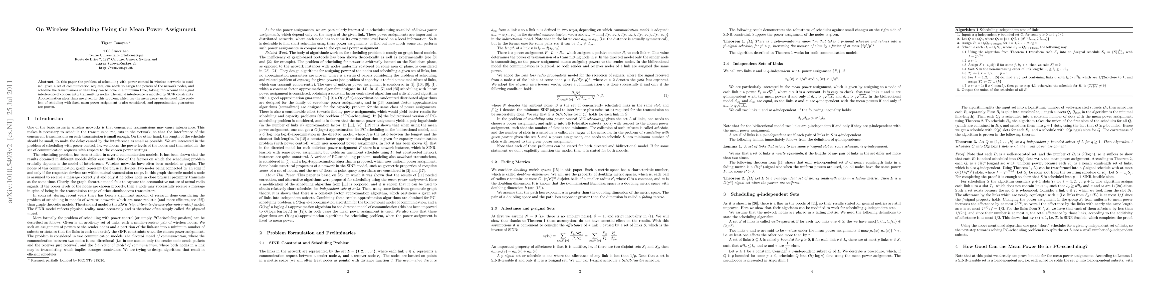 In this paper the problem of scheduling with power control in wireless networks is studied: given a set of communication requests, one needs to assign the powers of the network nodes, and schedule the transmissions so that they can be done in a minimum time, taking into account the signal interference of concurrently transmitting nodes. The signal interference is modeled by SINR constraints. Approximation algorithms are given for this problem, which use the mean power assignment. The problem of schduling with fixed mean power assignment is also considered, and approximation guarantees are proven.