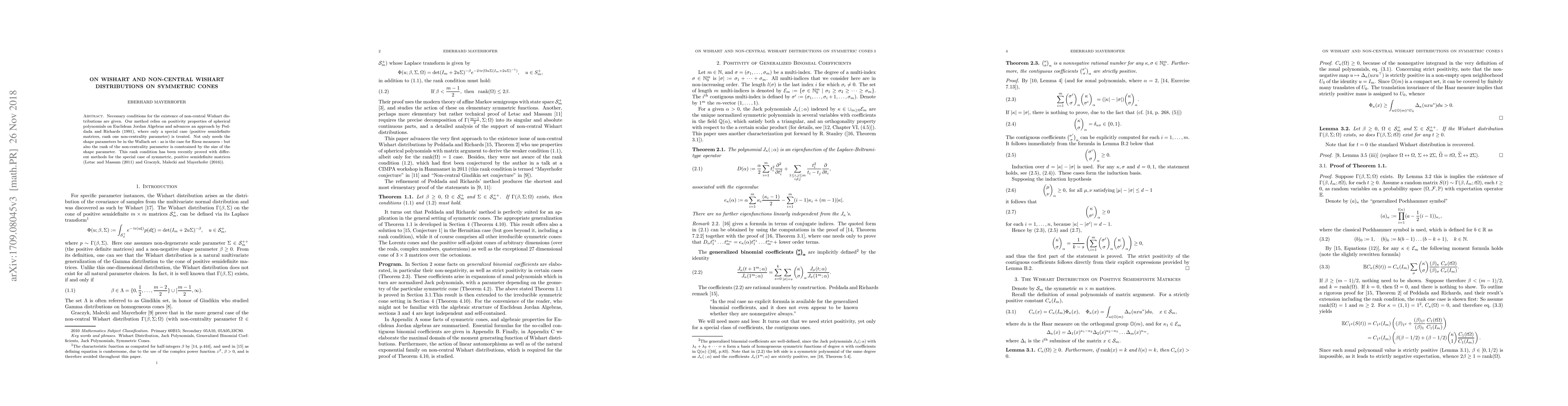 Necessary conditions for the existence of non-central Wishart distributions are given. Our method relies on positivity properties of spherical polynomials on Euclidean Jordan Algebras and advances an approach by Peddada and Richards (1991), where only a special case (positive semidefinite matrices, rank one non-centrality parameter) is treated. Not only needs the shape parameters be in the Wallach set - as is the case for Riesz measures - but also the rank of the non-centrality parameter is constrained by the size of the shape parameter. This rank condition has been recently proved with different methods for the special case of symmetric, positive semidefinite matrices (Letac and Massam (2011) and Graczyk, Malecki and Mayerhofer (2016)).