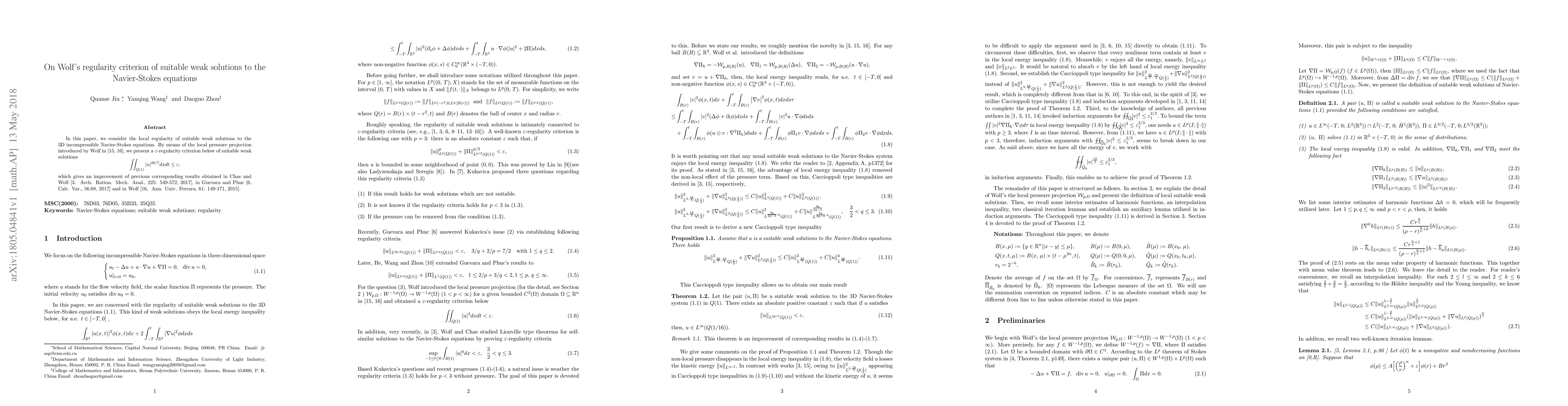 This paper improves upon previous results regarding the regularity of suitable weak solutions to the 3D Navier-Stokes equations, introducing a new $\varepsilon$-regularity criterion based on Wolf's local pressure projection. The criterion presented here provides a more refined estimate compared to earlier findings.