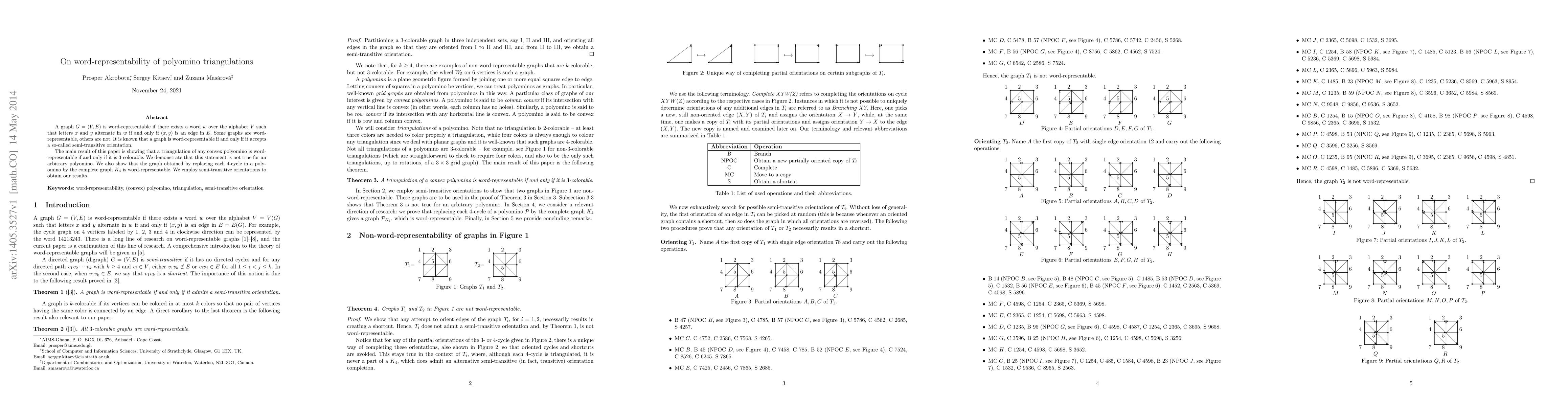 A graph $G=(V,E)$ is word-representable if there exists a word $w$ over the alphabet $V$ such that letters $x$ and $y$ alternate in $w$ if and only if $(x,y)$ is an edge in $E$. Some graphs are word-representable, others are not. It is known that a graph is word-representable if and only if it accepts a so-called semi-transitive orientation. The main result of this paper is showing that a triangulation of any convex polyomino is word-representable if and only if it is 3-colorable. We demonstrate that this statement is not true for an arbitrary polyomino. We also show that the graph obtained by replacing each $4$-cycle in a polyomino by the complete graph $K_4$ is word-representable. We employ semi-transitive orientations to obtain our results.