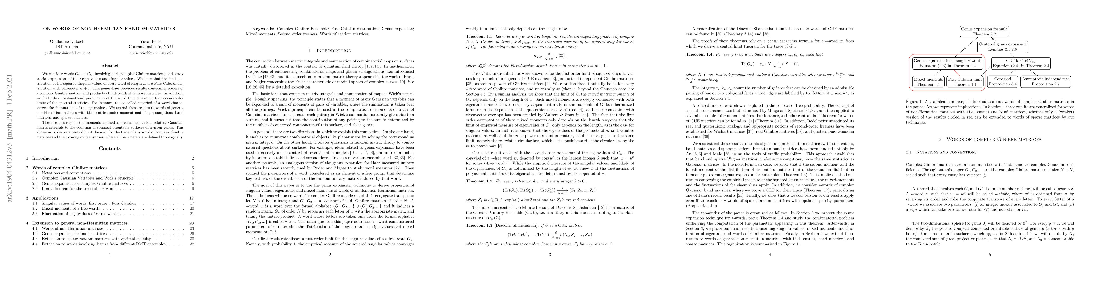 We consider words $G_{i_1} \cdots G_{i_m}$ involving i.i.d. complex Ginibre matrices, and study tracial expressions of their eigenvalues and singular values. We show that the limit distribution of the squared singular values of every word of length $m$ is a Fuss-Catalan distribution with parameter $m+1$. This generalizes previous results concerning powers of a complex Ginibre matrix, and products of independent Ginibre matrices. In addition, we find other combinatorial parameters of the word that determine the second-order limits of the spectral statistics. For instance, the so-called coperiod of a word characterizes the fluctuations of the eigenvalues. We extend these results to words of general non-Hermitian matrices with i.i.d. entries under moment-matching assumptions, band matrices, and sparse matrices. These results rely on the moments method and genus expansion, relating Gaussian matrix integrals to the counting of compact orientable surfaces of a given genus. This allows us to derive a central limit theorem for the trace of any word of complex Ginibre matrices and their conjugate transposes, where all parameters are defined topologically.