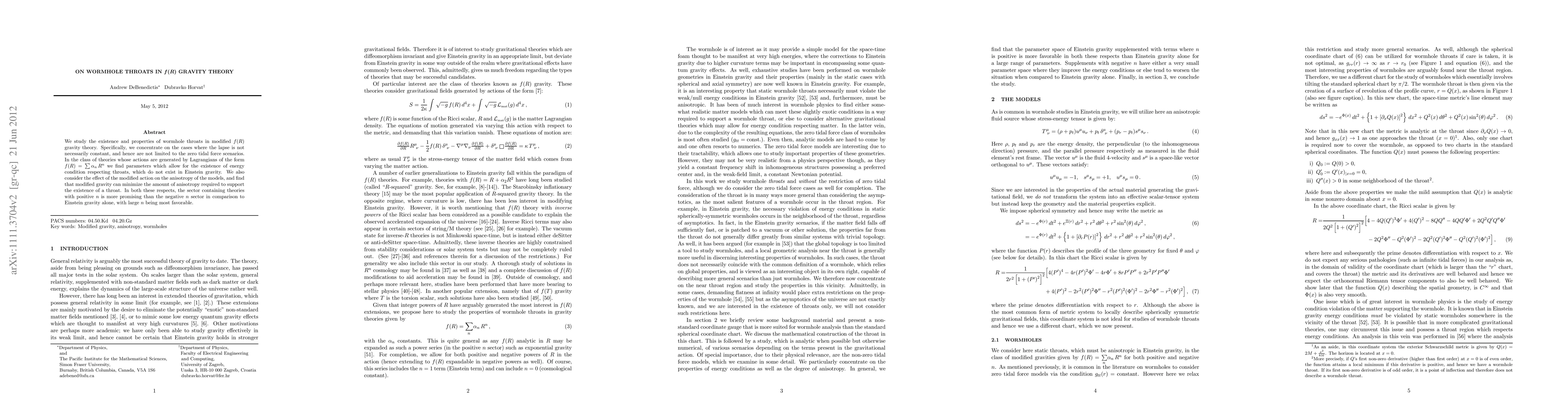 We study the existence and properties of wormhole throats in modified $f(R)$ gravity theory. Specifically, we concentrate on the cases where the lapse is not necessarily constant, and hence are not limited to the zero tidal force scenarios. In the class of theories whose actions are generated by Lagrangians of the form $f(R)=\sum \alpha_{n}\,R^{n}$ we find parameters which allow for the existence of energy condition respecting throats, which do not exist in Einstein gravity. We also consider the effect of the modified action on the anisotropy of the models, and find that modified gravity can minimize the amount of anisotropy required to support the existence of a throat. In both these respects, the sector containing theories with positive $n$ is more promising than the negative $n$ sector in comparison to Einstein gravity alone, with large $n$ being most favorable