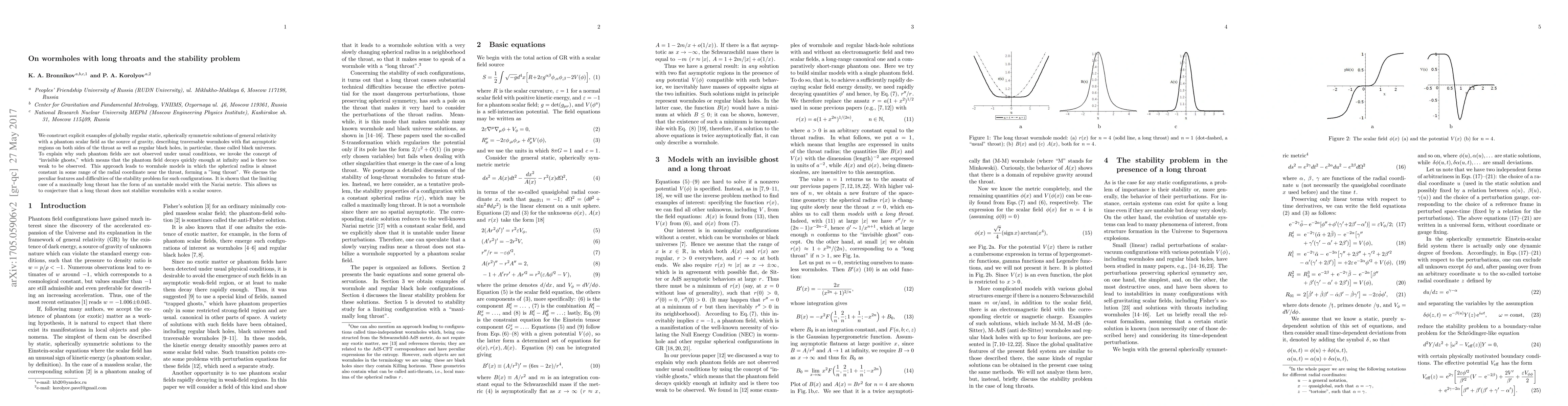 We construct explicit examples of globally regular static, spherically symmetric solutions of general relativity with a phantom scalar field as the source of gravity, describing traversable wormholes with flat asymptotic regions on both sides of the throat as well as regular black holes, in particular, those called black universes. To explain why such phantom fields are not observed under usual conditions, we invoke the concept of "invisible ghosts," which means that the phantom field decays quickly enough at infinity and is there too weak to be observed. This approach leads to wormhole models in which the spherical radius is almost constant in some range of the radial coordinate near the throat, forming a "long throat". We discuss the peculiar features and difficulties of the stability problem for such configurations. It is shown that the limiting case of a "maximally long throat" has the form of an unstable model with the Nariai metric. This allows us to conjecture that a long throat does not stabilize wormholes with a scalar source.