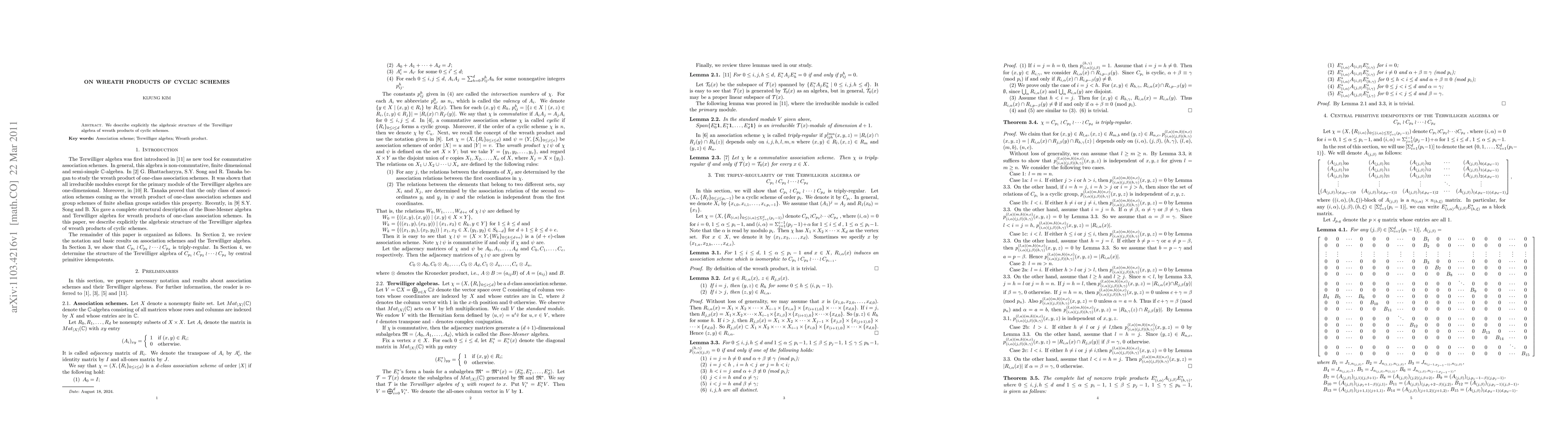 This paper provides an explicit description of the algebraic structure of the Terwilliger algebra associated with wreath products of cyclic schemes, contributing to the understanding of their combinatorial and algebraic properties.