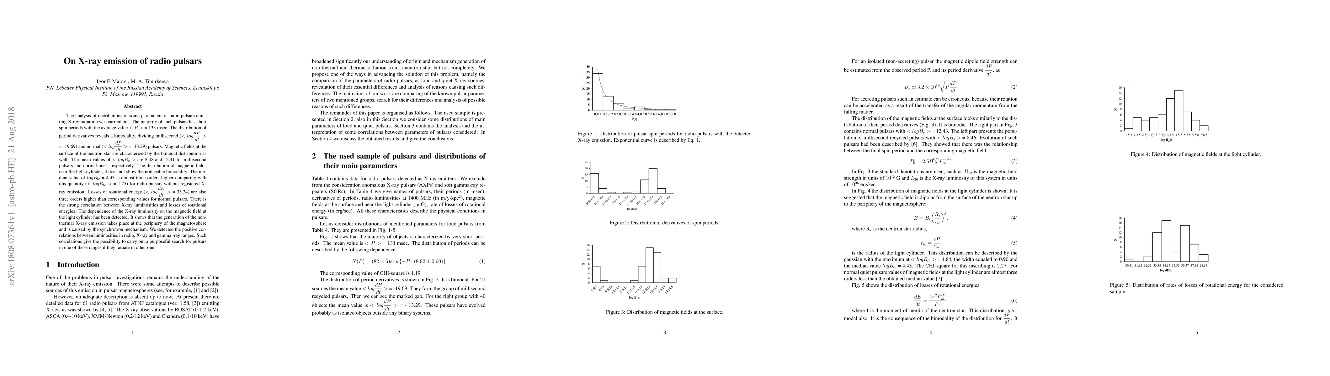 This paper investigates the X-ray emission from radio pulsars, revealing a bimodal distribution of spin periods and period derivatives, and magnetic fields. The study shows that X-ray-emitting pulsars have higher rotational energy losses and stronger correlations between radio, X-ray, and gamma-ray luminosities, suggesting synchrotron emission at the magnetosphere's periphery.