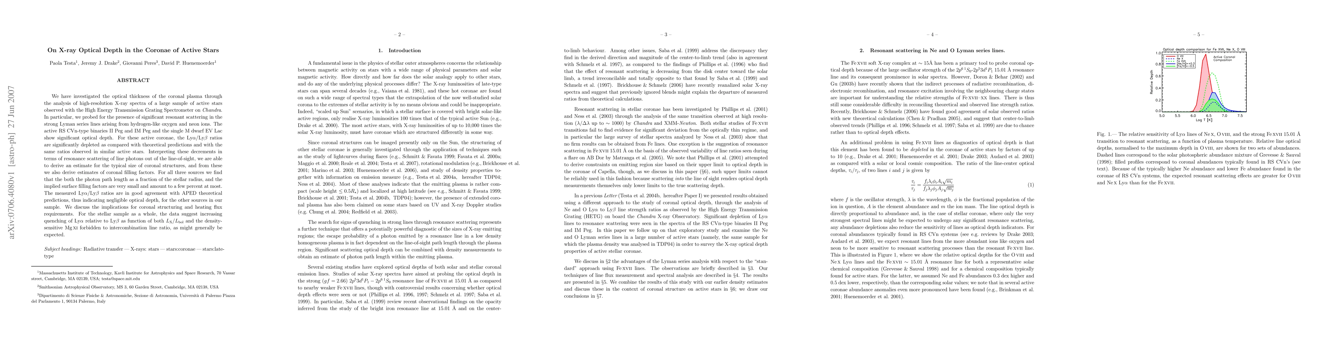This study investigates the optical depth of coronal plasma in active stars using high-resolution X-ray spectra, finding significant resonant scattering in the Lyman series lines of oxygen and neon in specific stars, which implies small coronal structures and filling factors. The results suggest a correlation between X-ray luminosity and quenching of the Lya line relative to Lyb.