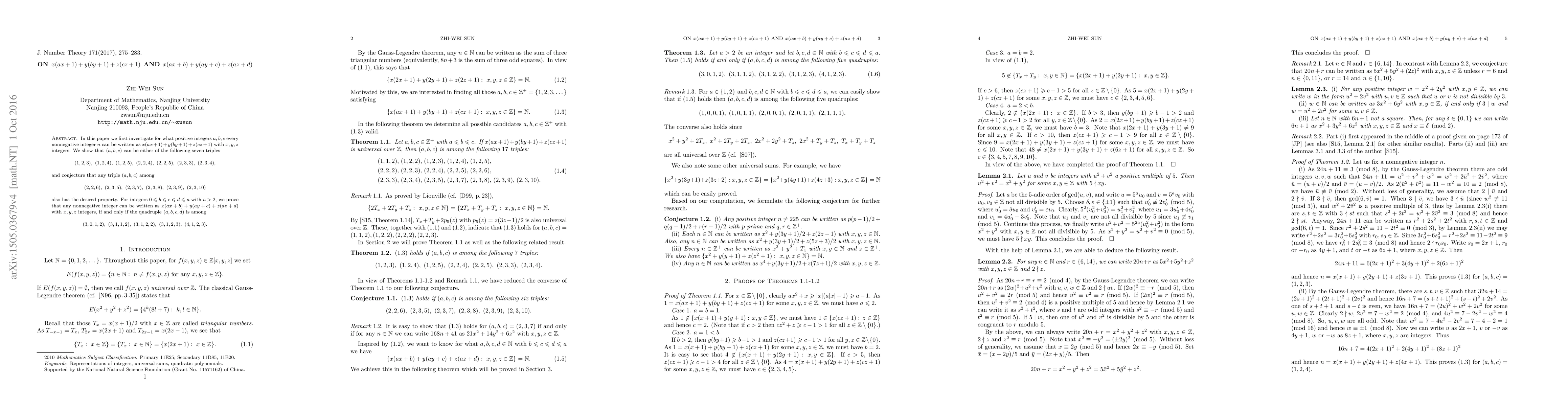 This paper studies representations of nonnegative integers using specific forms involving integers $x$, $y$, and $z$. It identifies seven triples $(a,b,c)$ that allow every nonnegative integer to be expressed as $x(ax+1)+y(by+1)+z(cz+1)$ and conjectures similar properties for other triples. Additionally, it proves that for integers $0\leq b\leq c\leq d\leq a$ with $a>2$, every nonnegative integer can be expressed as $x(ax+b)+y(ay+c)+z(az+d)$ if and only if $(a,b,c,d)$ falls within a specified set of quadruples.
