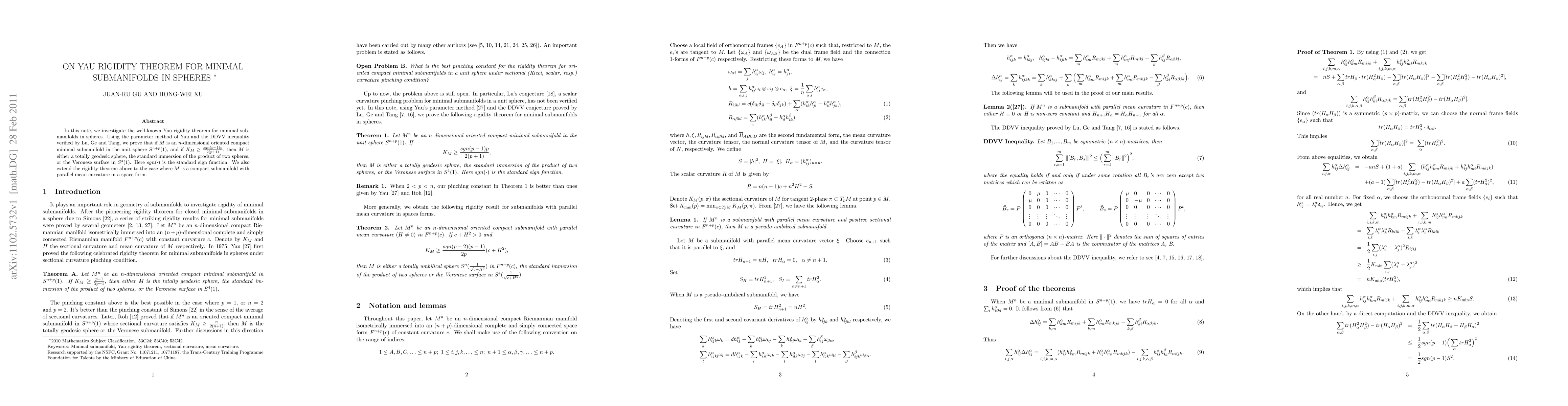 This paper proves the Yau rigidity theorem for minimal submanifolds in spheres, showing that under certain curvature conditions, such submanifolds must be either totally geodesic spheres, specific products of spheres, or the Veronese surface in four dimensions. It also extends these results to submanifolds with parallel mean curvature in space forms.
