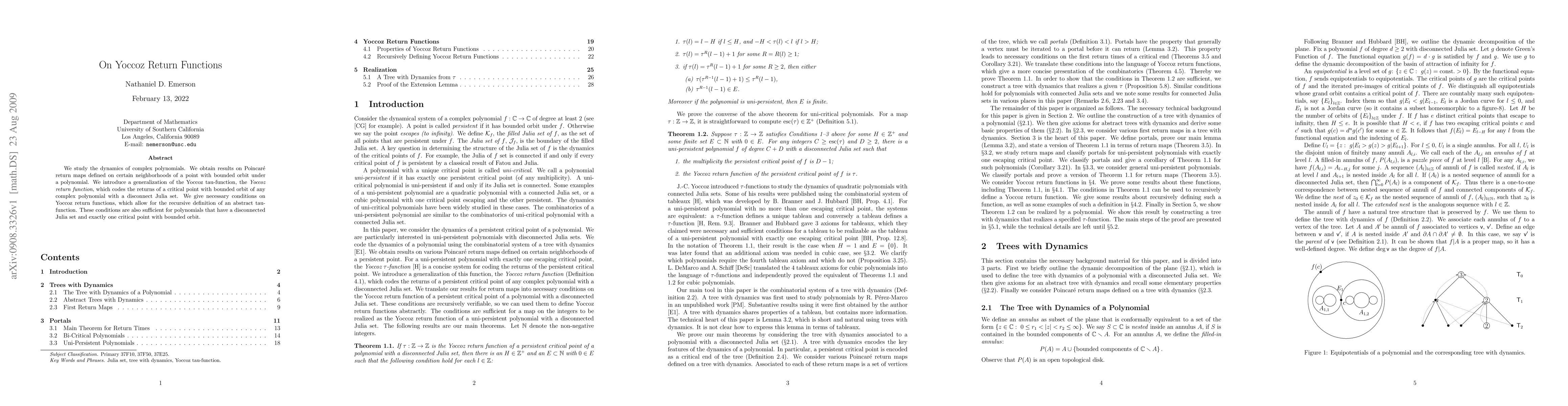 We study the dynamics of complex polynomials. We obtain results on Poincare return maps defined on certain neighborhoods of a point with bounded orbit under a polynomial. We introduce a generalization of the Yoccoz tau-function, the Yoccoz return function, which codes the returns of a critical point with bounded orbit of any complex polynomial with a disconnect Julia set. We give necessary conditions on Yoccoz return functions, which allow for the recursive definition of an abstract tau-function. These conditions are also sufficient for polynomials that have a disconnected Julia set and exactly one critical point with bounded orbit.