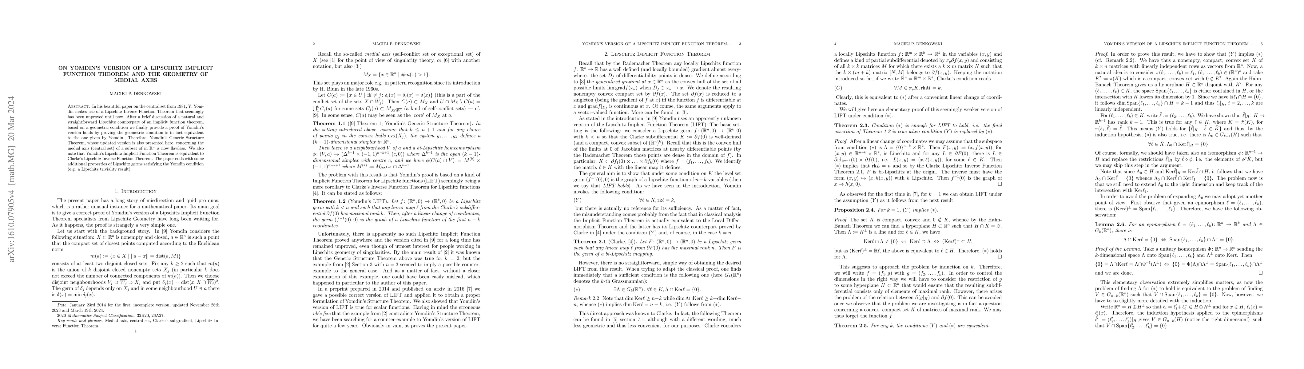 In his beautiful paper on the central set from 1981, Y. Yomdin makes use of a Lipschitz Inverse Function Theorem that seemingly has been unproved until now. After a brief discussion of a natural and straightforward Lipschitz counterpart of an implicit function theorem, based on a geometric condition we finally provide a proof of Yomdin's version holds by proving the geometric condition is in fact equivalent to the one given by Yomdin. Therefore, Yomdin's Generic Structure Theorem, whose updated version is also presented here, concerning the medial axis (central set) of a subset of in ${\Rz}^n$ is now flawless. We also note that Yomdin's Lipschitz Implicit Function Theorem is equivalent to Clarke's Lipschitz Inverse Function Theorem. The paper ends with some additional properties of Lipschitz germs satisfying the Yomdin condition (e.g. a Lipschitz triviality result).
