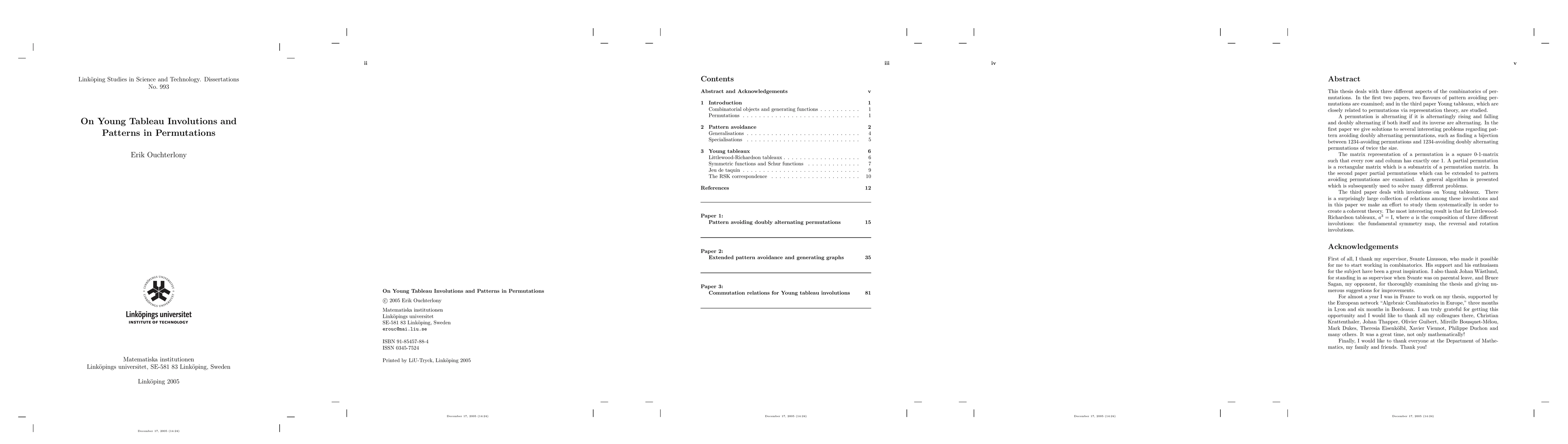 This thesis deals with three different aspects of the combinatorics of permutations. In the first two papers, two flavours of pattern avoiding permutations are examined; and in the third paper Young tableaux, which are closely related to permutations via representation theory, are studied. In the first paper we give solutations to several interesting problems regarding pattern avoiding doubly alternating permutations, such as finding a bijection between 1234-avoiding permutations and 1234-avoiding doubly alternating permutations of twice the size. In the second paper partial permutations which can be extended to pattern avoiding permutations are examined. A general algorithm is presented which is subsequently used to solve many different problems. The third paper deals with involutions on Young tableaux. There is a surprisingly large collection of relations among these involutions and in the paper we make the effort to study them systematically in order to create a coherent theory. The most interesting result is that for Littlewood-Richardson tableaux, $a^3=1$, wher5e $a$ is the composition of three different involutions: the fundamental symmetry map, the reversal and rotation involutions.